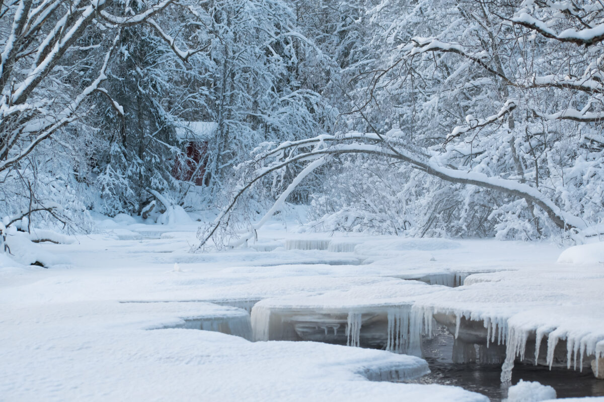 Koski jäätynyt ja vesi laskenut saanut aikaan kauniita jäälauttoja ja puikkoja