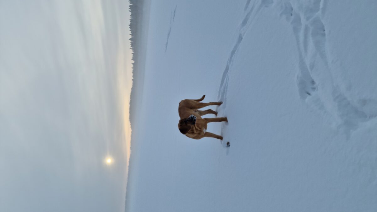 Kuvassa on koirani Sulo, olemme järvikävelyllä sumuisena sunnuntaiaamuna.