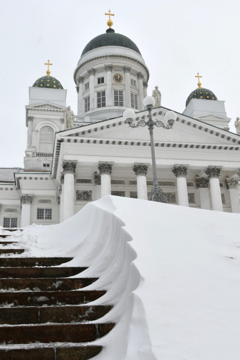 Lumipyry muodosti hienot kuviot Helsingin tuomiokirkon portaisiin.