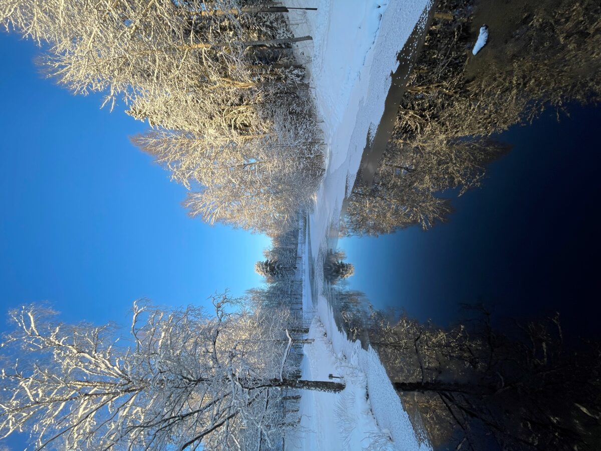 Uudenvuoden päivänä oli aurinkoinen kirpeä pakkaspäivä, lumiset puut heijastuivat kauniisti vielä avoimena virtaavan joen pintaan. Kuva on Teuronjoelta Hämeenkoskelta (Hollola)
