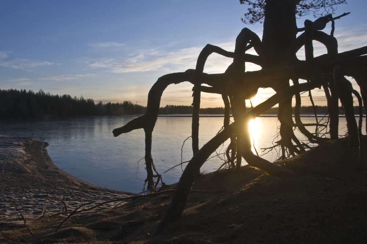 Uimarannan hiekka on kulkeutunut pois männyn juurien alta.