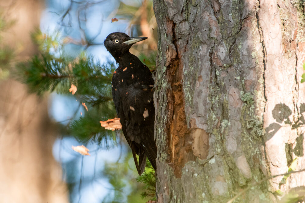 Ja seitsemännessä se hakkaa toukkia männyn kaarnan alta niin että lastut vain lentelevät. Et ehkä arvaa, että otin tämän kuvan soutuveneestä. Huomasin palokärjen puuhissaan, kun hiljaksiin kiertelin härkälintuja kuvaamassa. Annoin veneen lipua hitaasti. Välillä huopasin varovasti lähemmäksi. Palokärki ei ihmetellyt, että joku seuraa sitä järveltä veneeestä, vaan jatkoi ruokailua kaikessa rauhassa.