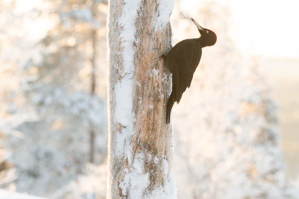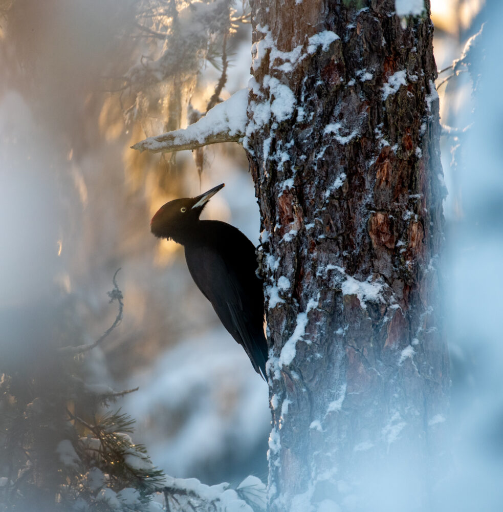 Tässä blogissa on seitsemän kuvaa palokärjen elämästä: tunnelma keskitalven luonnosta läheltä metsäruokintapaikkaa, johon palokärki on oppinut pian 15 vuotta sitten. Toinen kuva on Kuusamon Oulangan laaksosta. Monena vuonna palokärki vierailee siellä maakotkan kanssa samalla ruokapaikalla. Kolmannessa tämä kumma lintu keikkuu ilmassa poukkoillen mutta päättäväisesti lentäen hakemaan muurahaisia pesäkolossa odottaville poikasilleen. Seuraavassa palokärki istuu tunnelmallisesti puunrungolla metsässään.