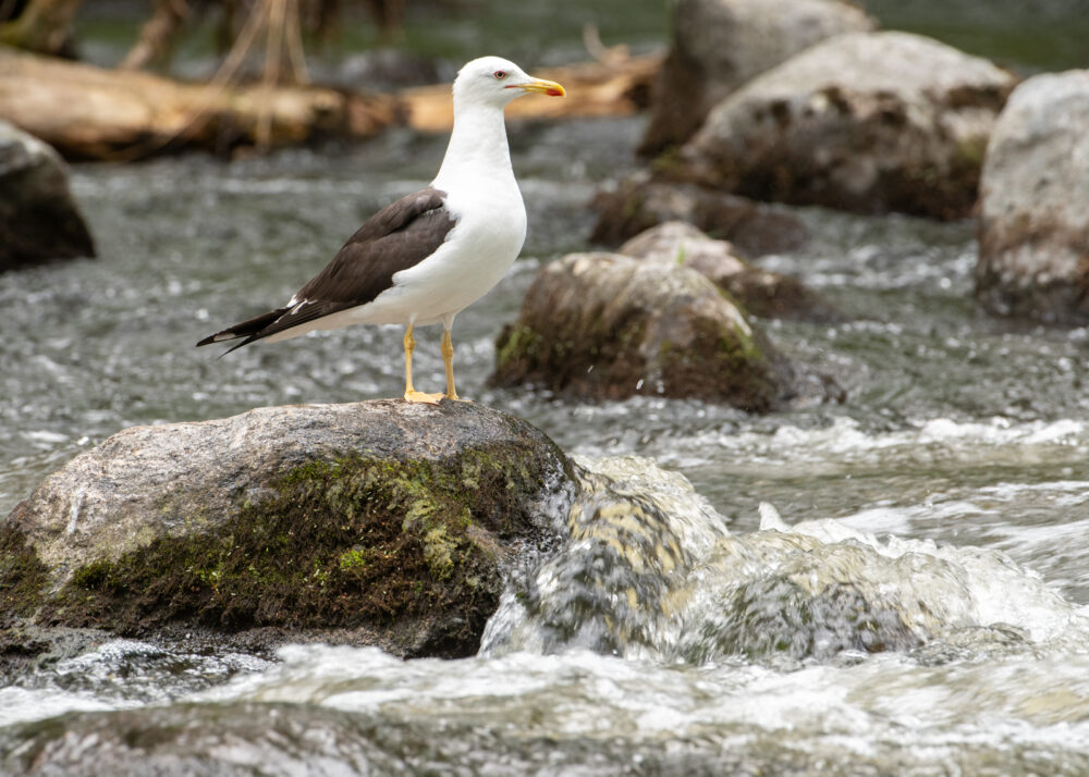 Selkälokki vierailee keskikesällä järvien välisissä virtapaikoissa kalassa.
