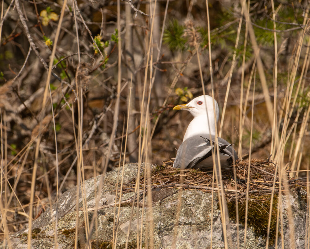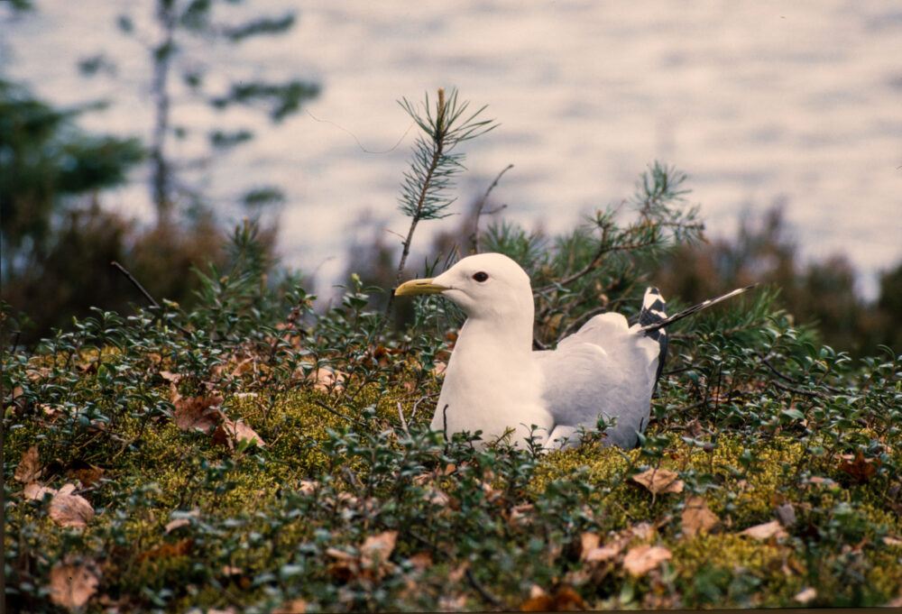 Kuvat: Samuli Haapasalo. Kalalokki hautoo noin 40 vuotta sitten Repoveden erämaassa, diasta digitalisoitu kuva