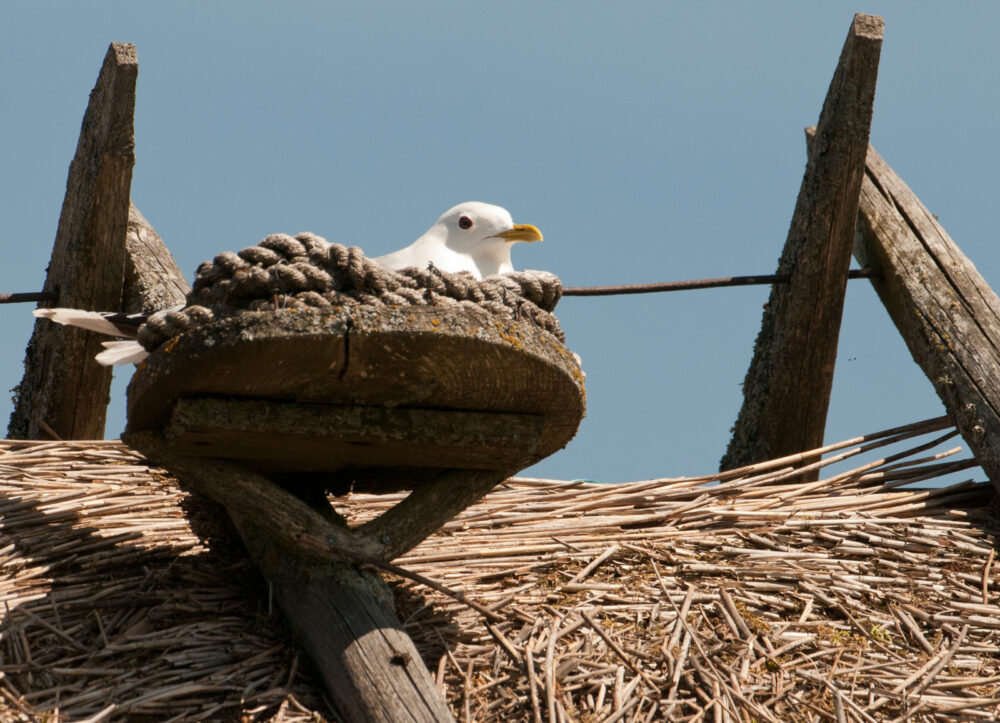 Tämä kalalokki on saanut perinne pesimäalustan ruokokattoisen talon katolle Matsalun lahdella