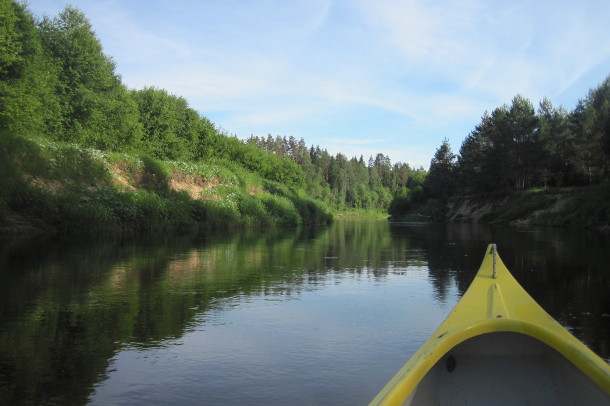 Pääsen aurinkoisena iltana melomaan Gauja-jokea alavirtaan. Ympärillä avautuu Latvian suurin kansallispuisto, joka tunnetaan monimuotoisista metsistä ja upeista hiekkakivimuodostumista. Alueella on myös useita kulttuurihistoriallisia kohteita. Minua kuitenkin kiinnostaa joki.