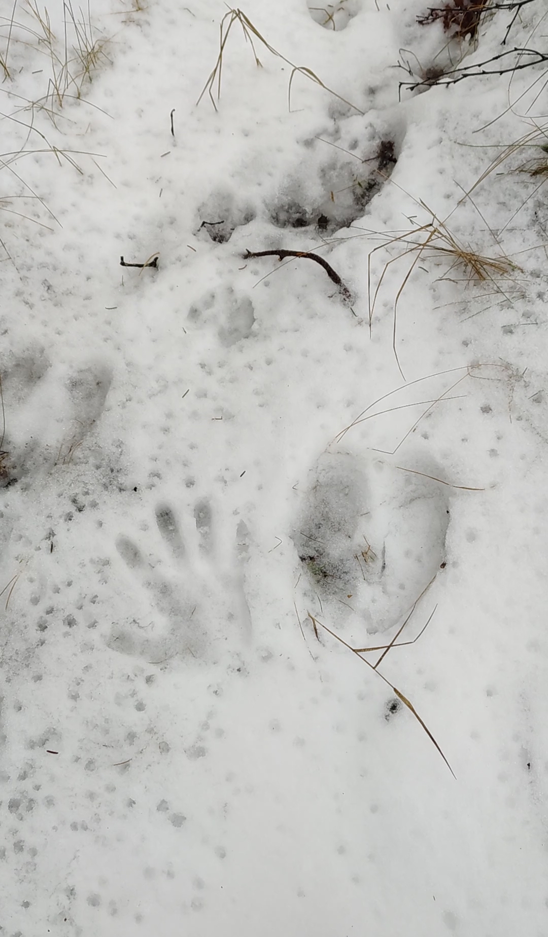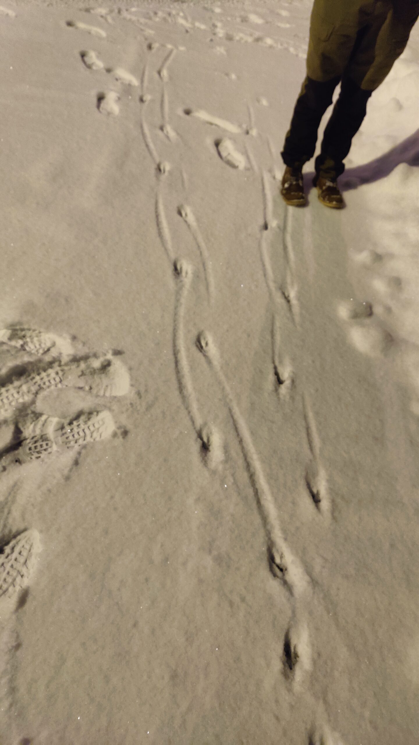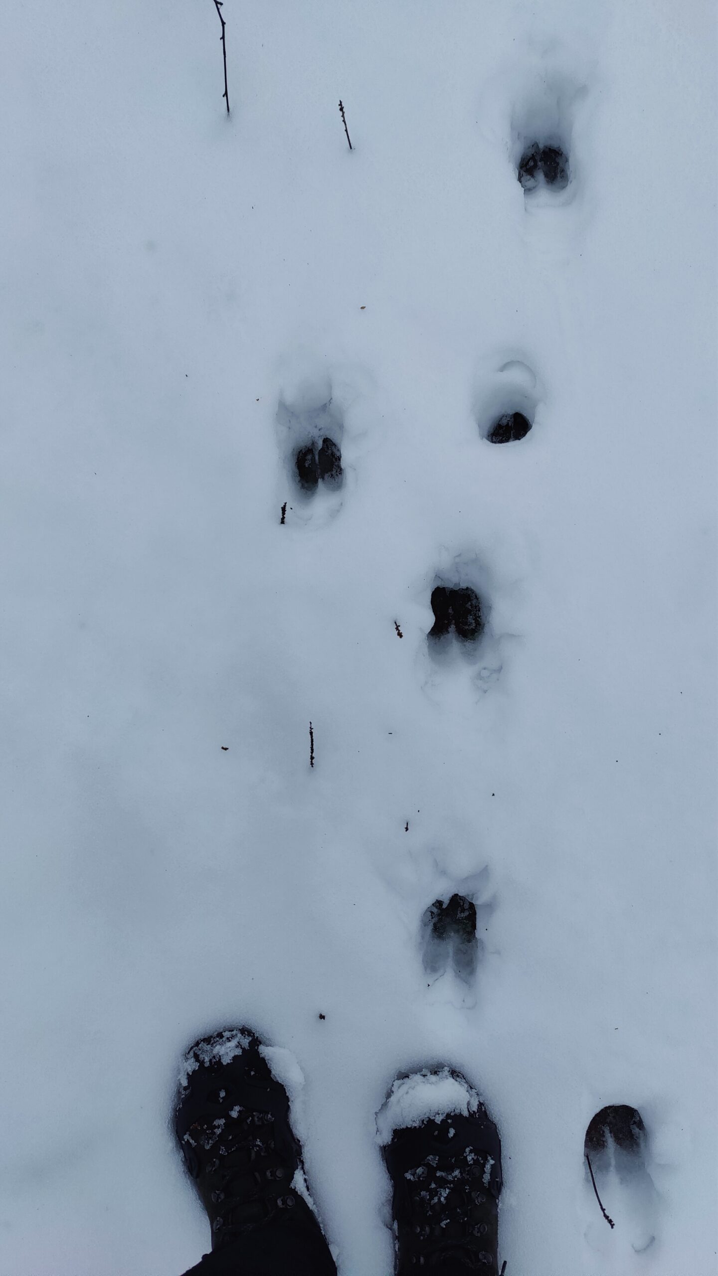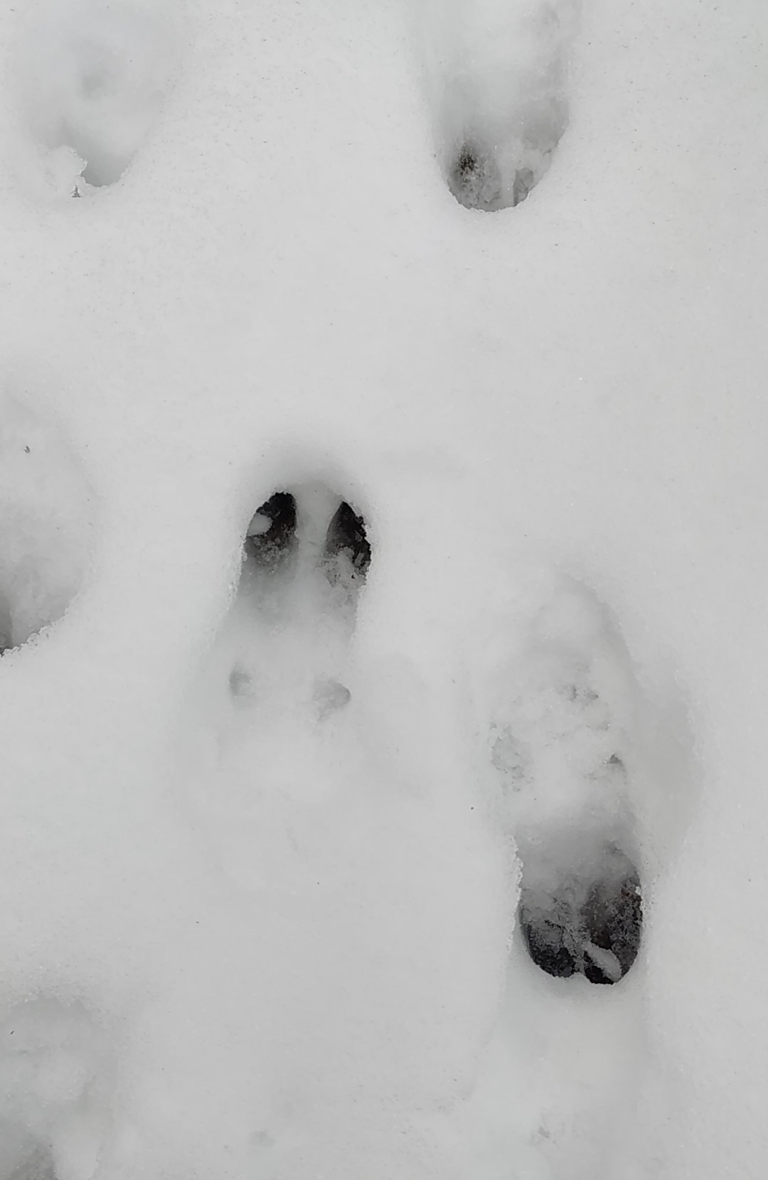 Hirven lumijälki on sorkkaeläimistä suurin, ilman lisäsorkan painaumaa 12–16-senttinen. Kuva ja tunnistus: Anna Tuominen