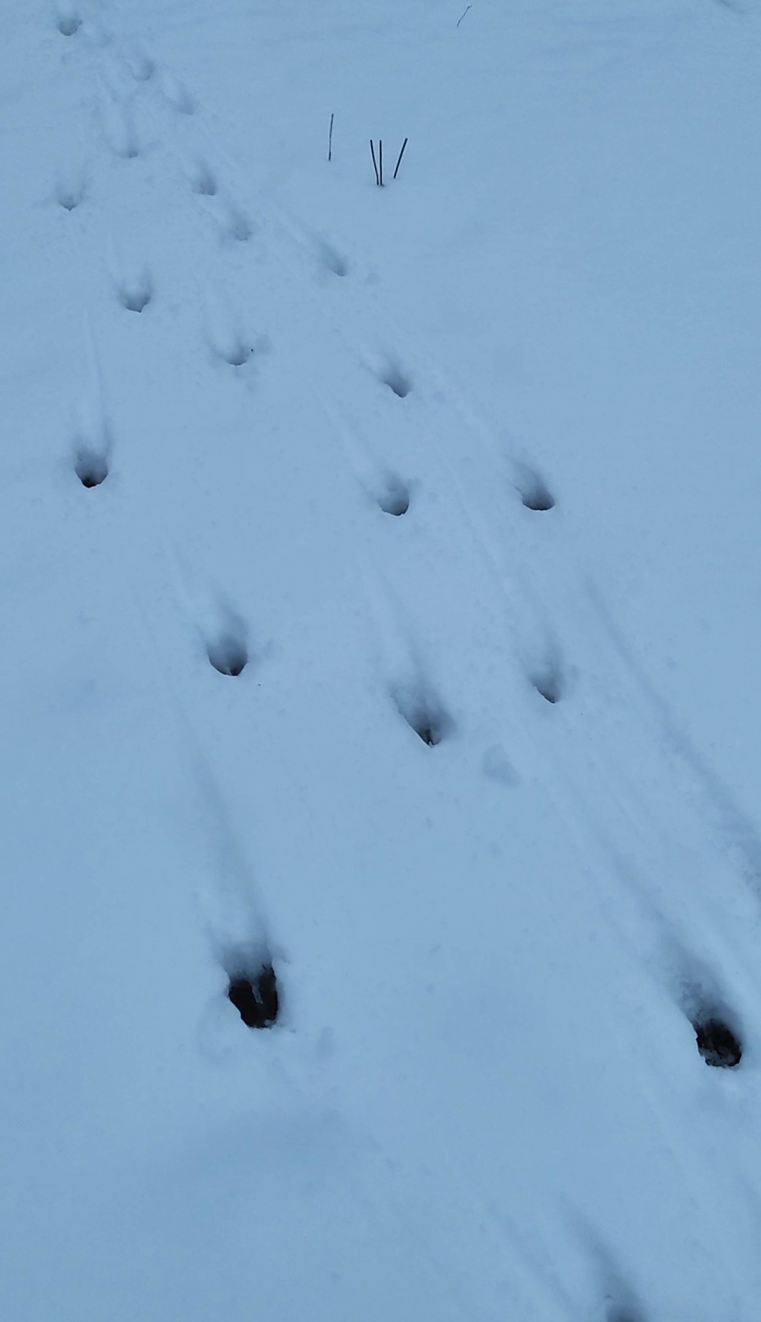 Metsäkauriin lumijälki on sorkkaeläimistä pienin ja siroin, vain 4–6 senttiä pitkä. Kuva ja tunnistus: Anna Tuominen