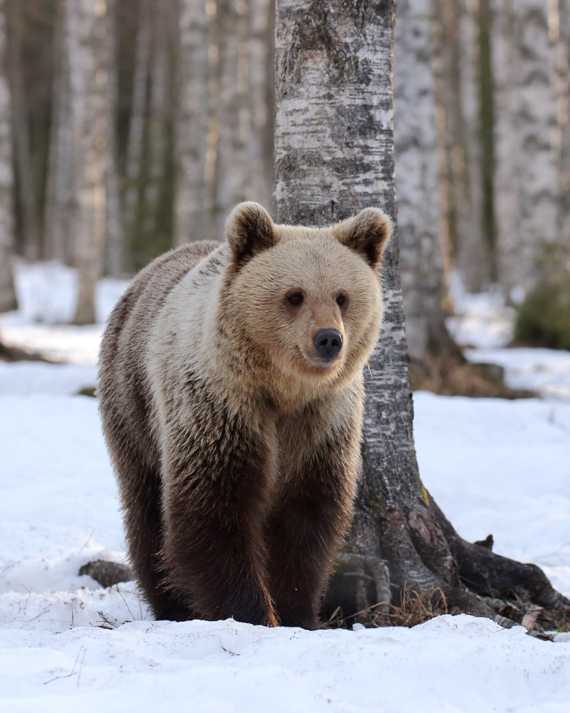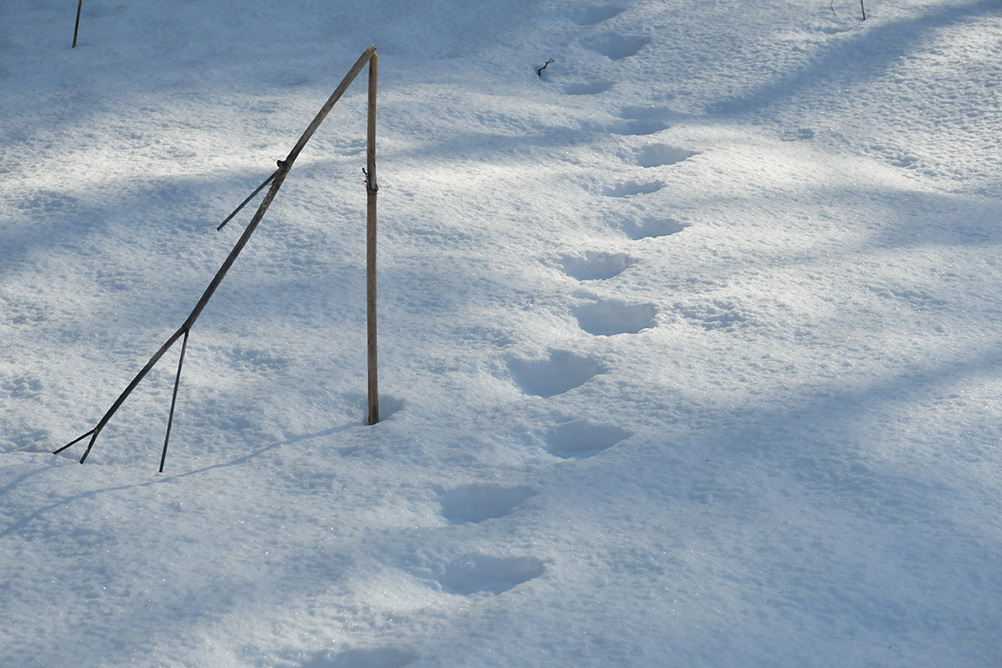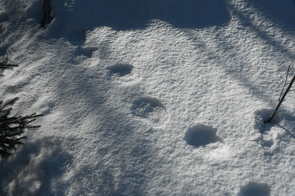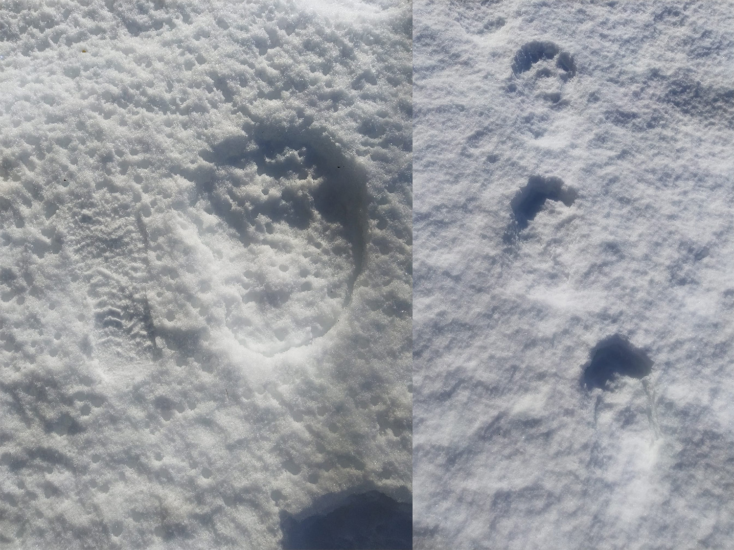 Sulaneet karhun jäljet kovalla kantohangella. Ensimmäinen kuva tuo nopeasti mieleen ihmisen jälkijonon eli lyhyt askelväli ja eläin on kanta-astuja niin kuin ihminen, jolloin koko jalkaterä jättää painallukset jälkeen ja jälkijonossa näkyy että eläin on vuorotellen astunut oikean ja vasemman jalan. Karhu on liikkunut yöllä tai aikaisin aamulla, jolloin keväinen kantohanki kestää karhun painon. Päivän mittaan aurinko on sulattanut hangen pintaa ja puista on tippunut sulavettä hangen pinnalle, jolloin siitä on tullut röpöläinen. Hitaassa käynnissä karhu on astunut etu- ja takakäpälän samaan jälkeen, jolloin takatassu suuri koko, pituus noin 25 cm, todella levä ja jäljen hieman kaareva muoto paljastavat sen karhun jäljeksi. Kuva on otettu seuraavana tai muutama päivä myöhemmin aamulla (hanki on pakkasyönä jäätynyt), kun valo on loivaa ja hanki kantaa ihmistä. Kolmannessa kuvassa näkyy ihmisen ja karhun jälkipainallus vierekkäin. Kuvat: Esa Kinnunen