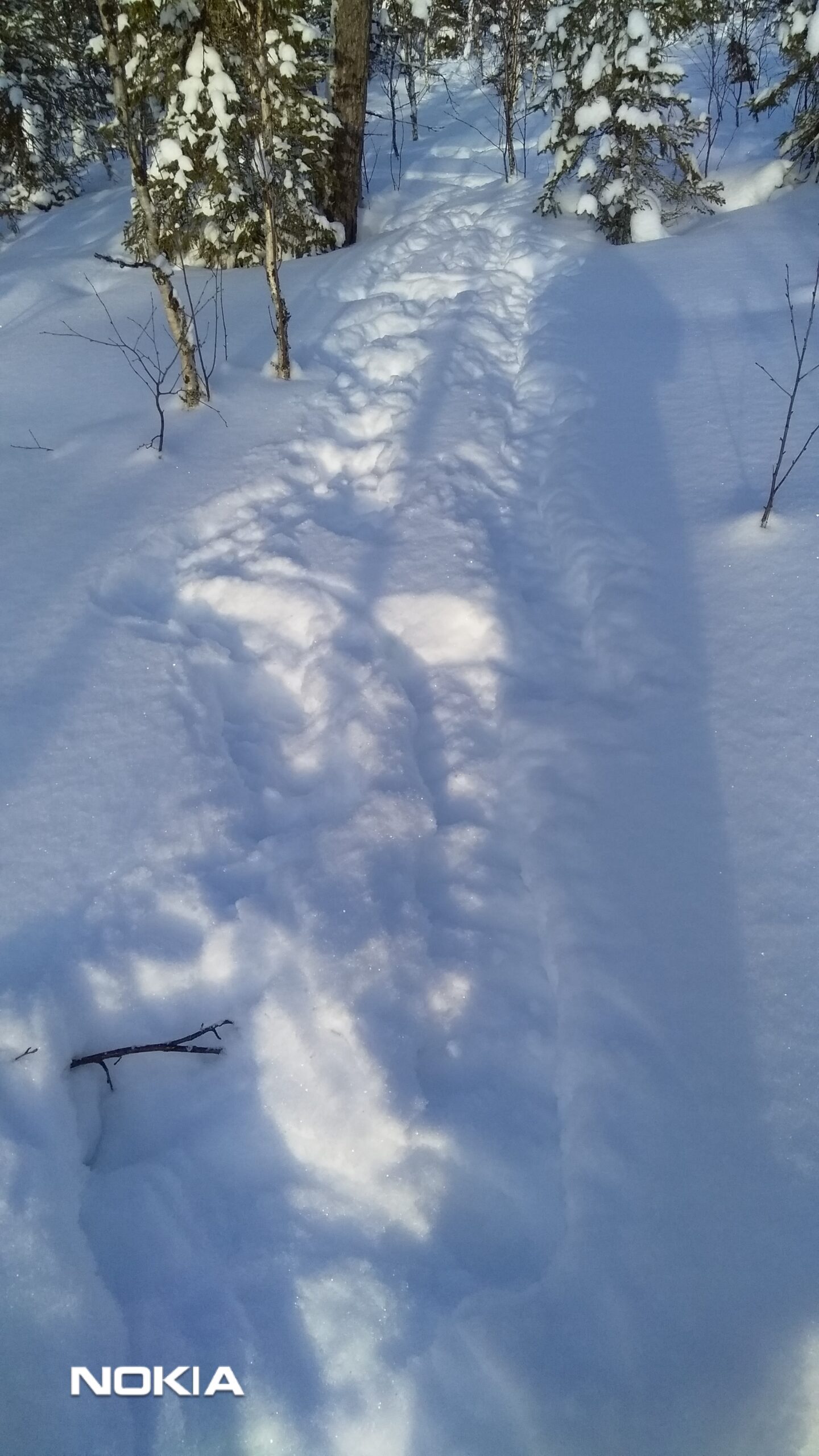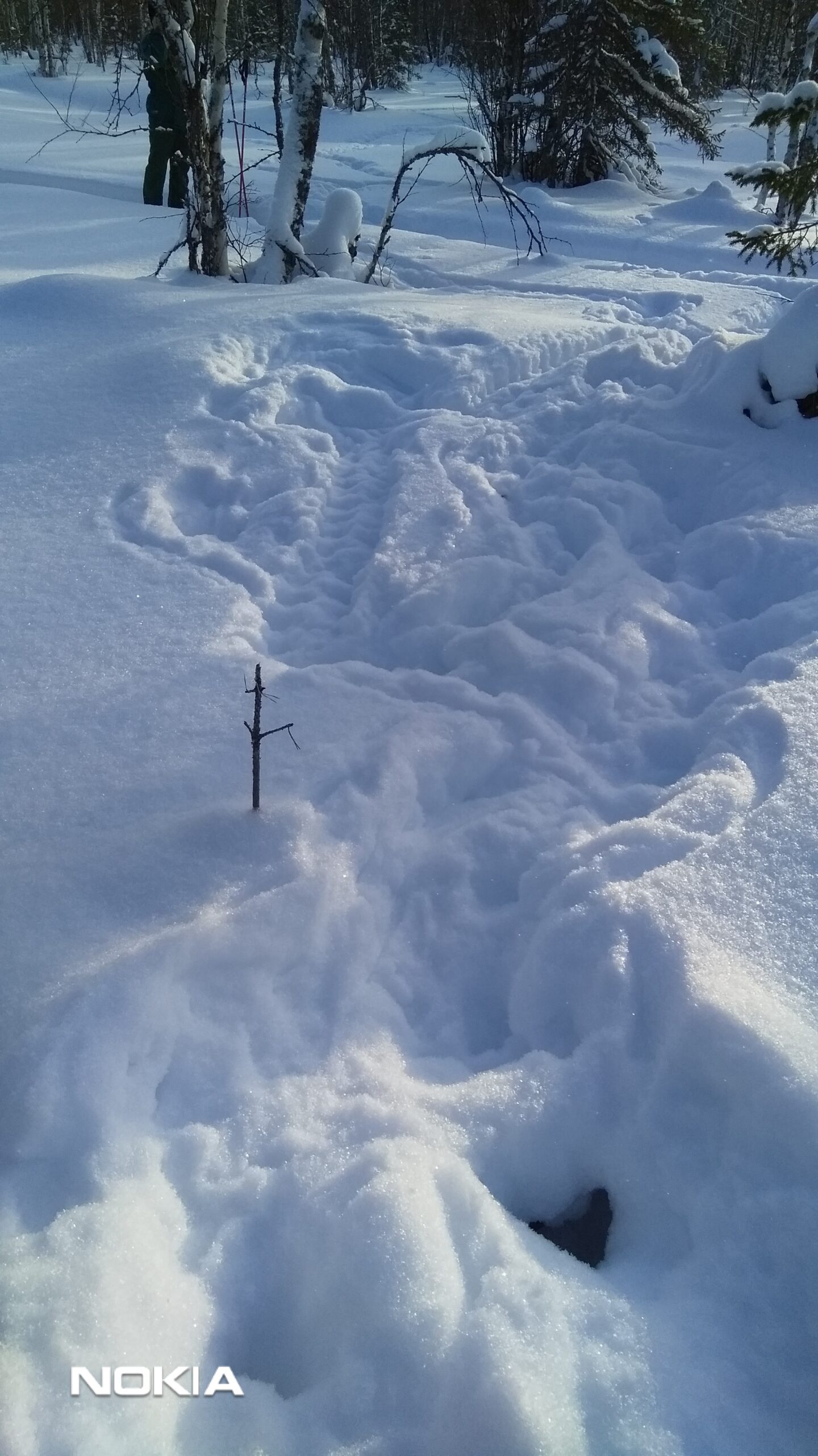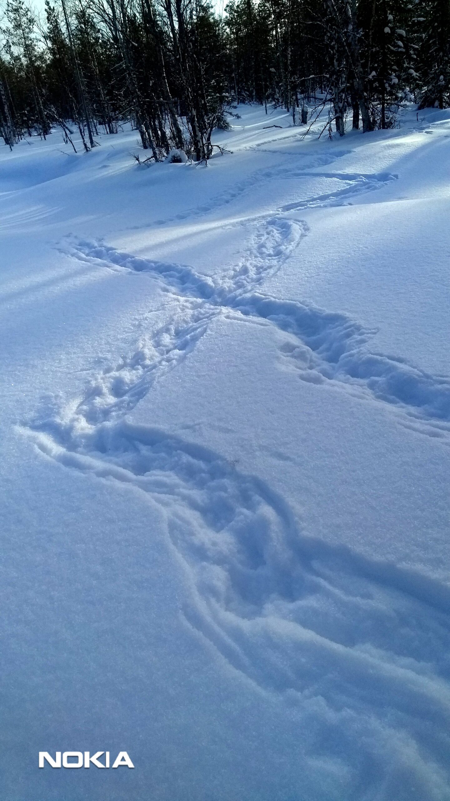 Majavan jälkijono. Majan vartalo ja häntä jättävät laajan yhtenäisen laahausjäljen. Askelväli on lyhyt aivan tepastellut lumessa lyhyillä jaloillaan. Lukijan kuva.