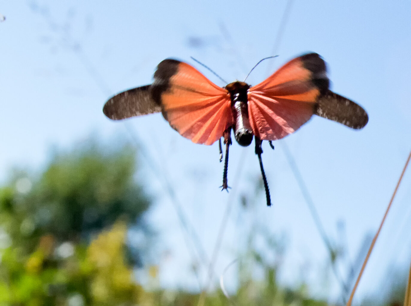 Tuntomerkit: Väritys vaihtelee tummanharmaasta tai ruskeasta lähes mustaan. Takasiivet kirkkaan oranssinpunaiset. Koiraan siivet pitävät rätisevää ääntä sen lentäessä.