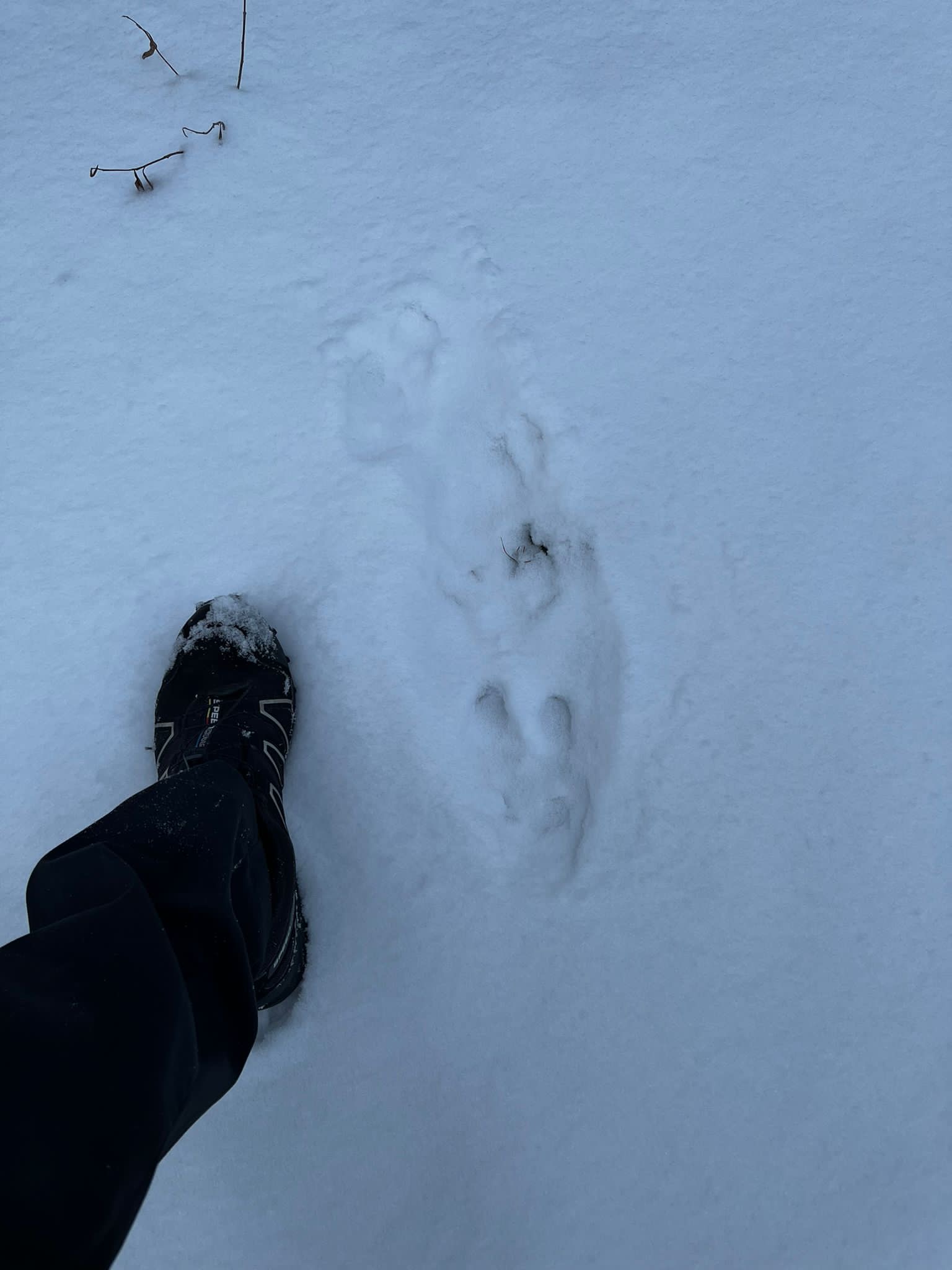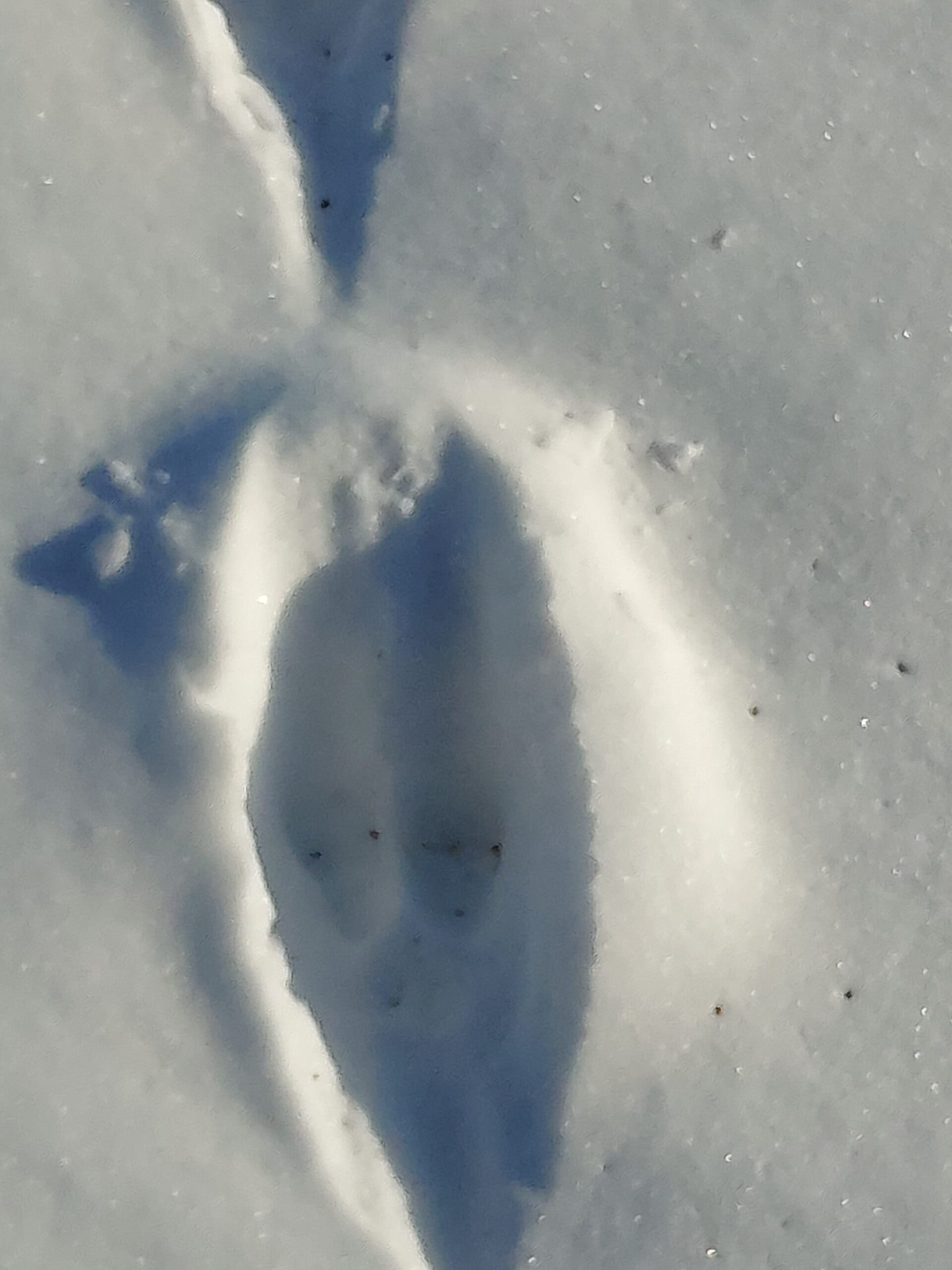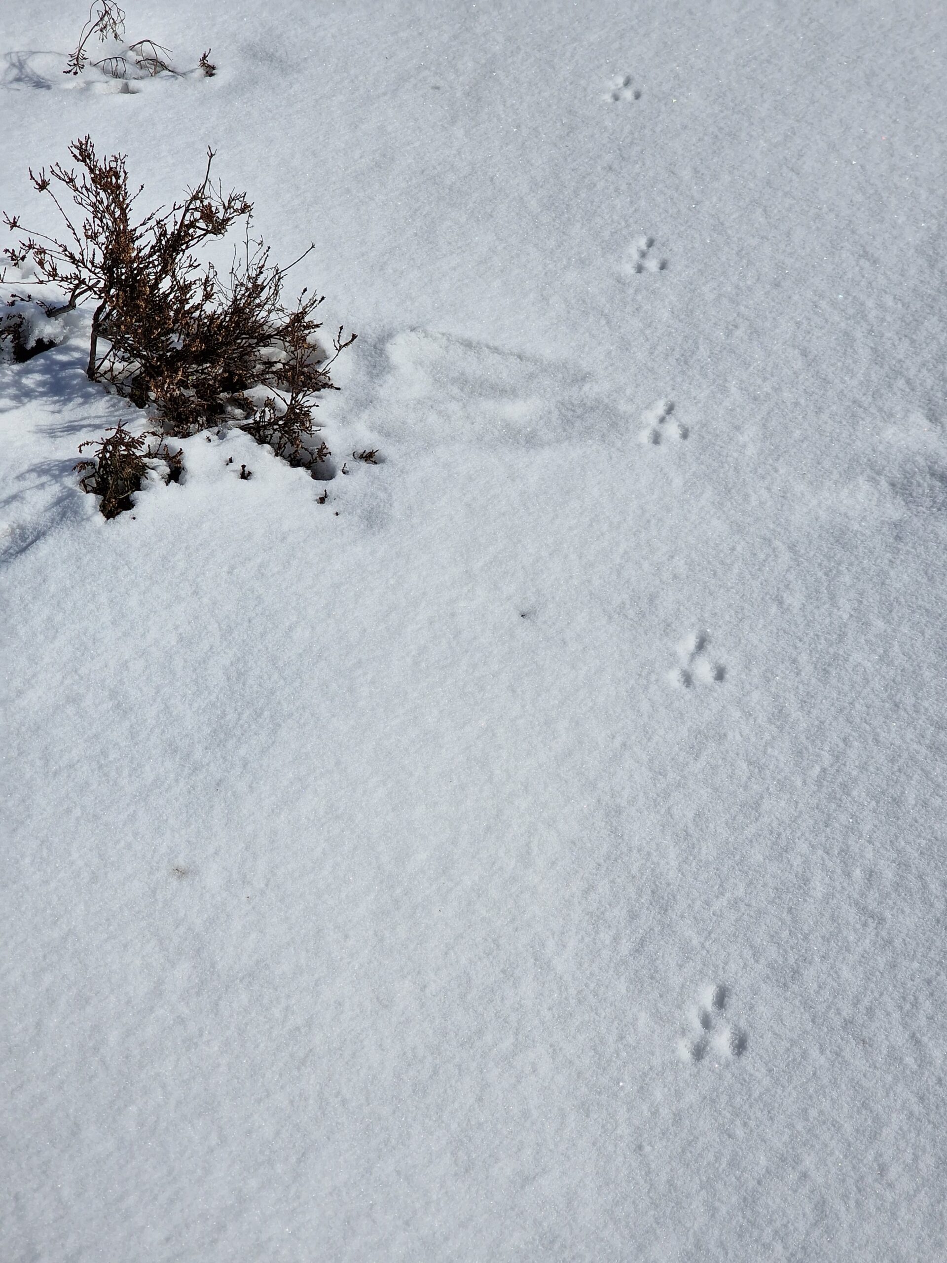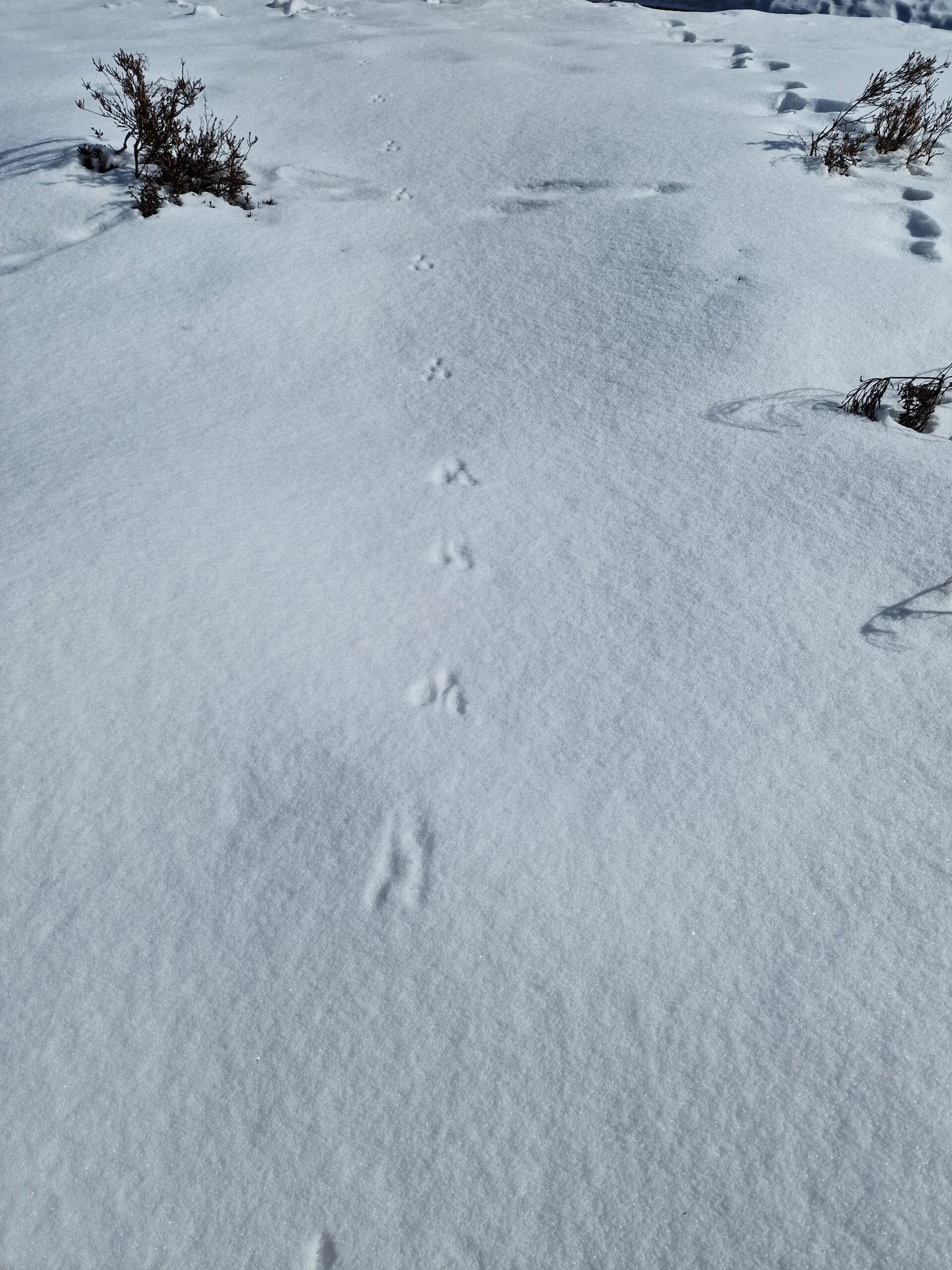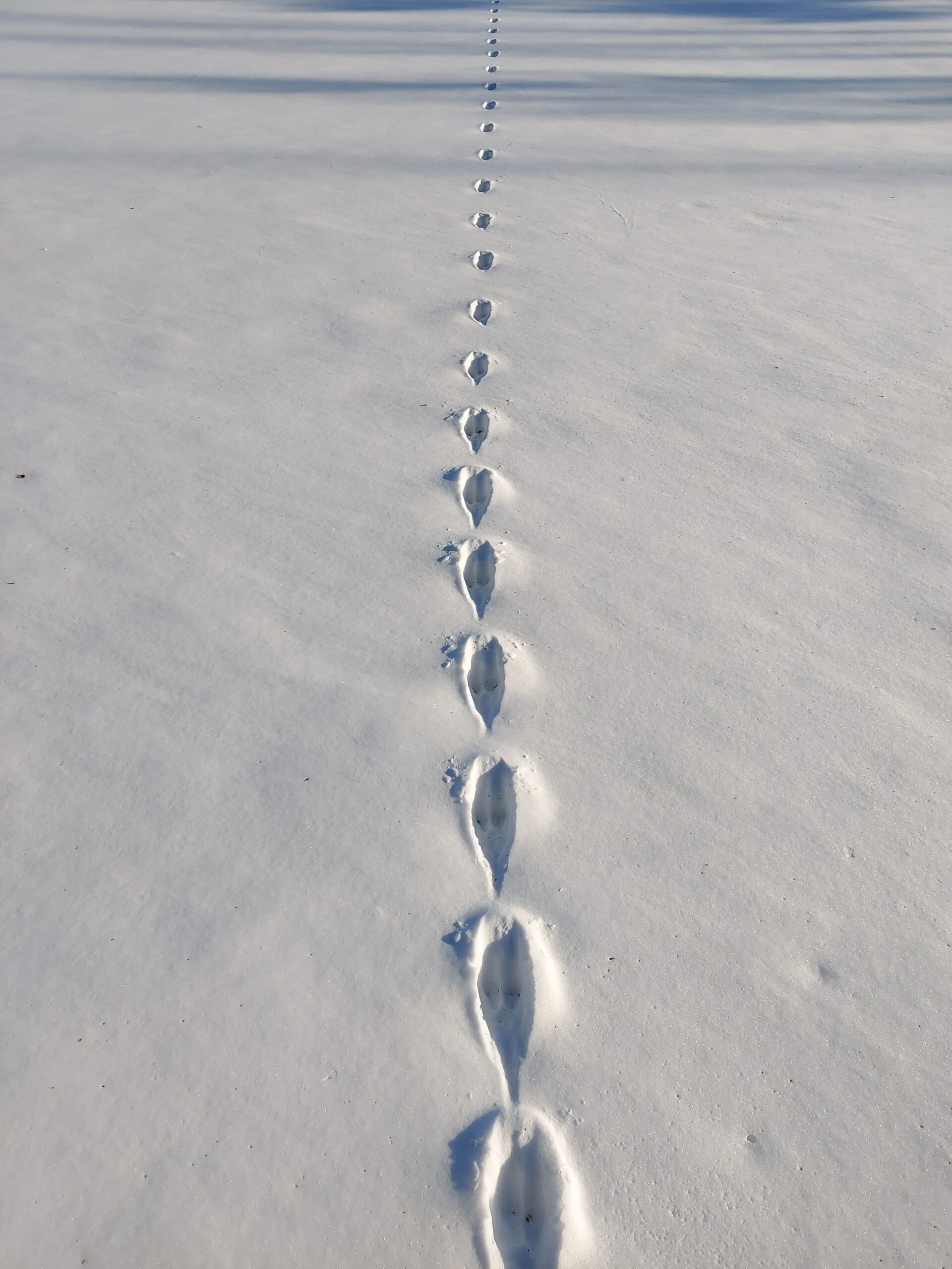 Lumikon nelijälkihyppyjä. Askelväli on selvästi pidempi kuin pikkunisäkkäillä ja lumikon etukäpälä kovalla alustalla saattaa olla vain 1–1,5 cm pitkä. Kuvat: Arja Tulonen