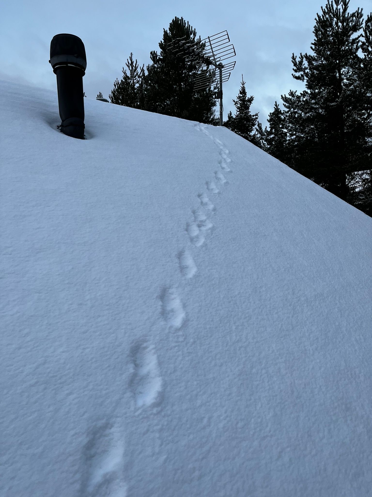 Näyttää näädän jäljiltä, joka on hyppinyt pitkin kattoa. Näädän tassun painallukset ovat aina hieman limittäin, mikä erottaa sen jäljen muista näätäeläimistä. Näädällä askelväli (hyppy) on kohtuullisen lyhyt ja tassut isot eläimen kokoon nähden. Kuvat: Anne Vesanen