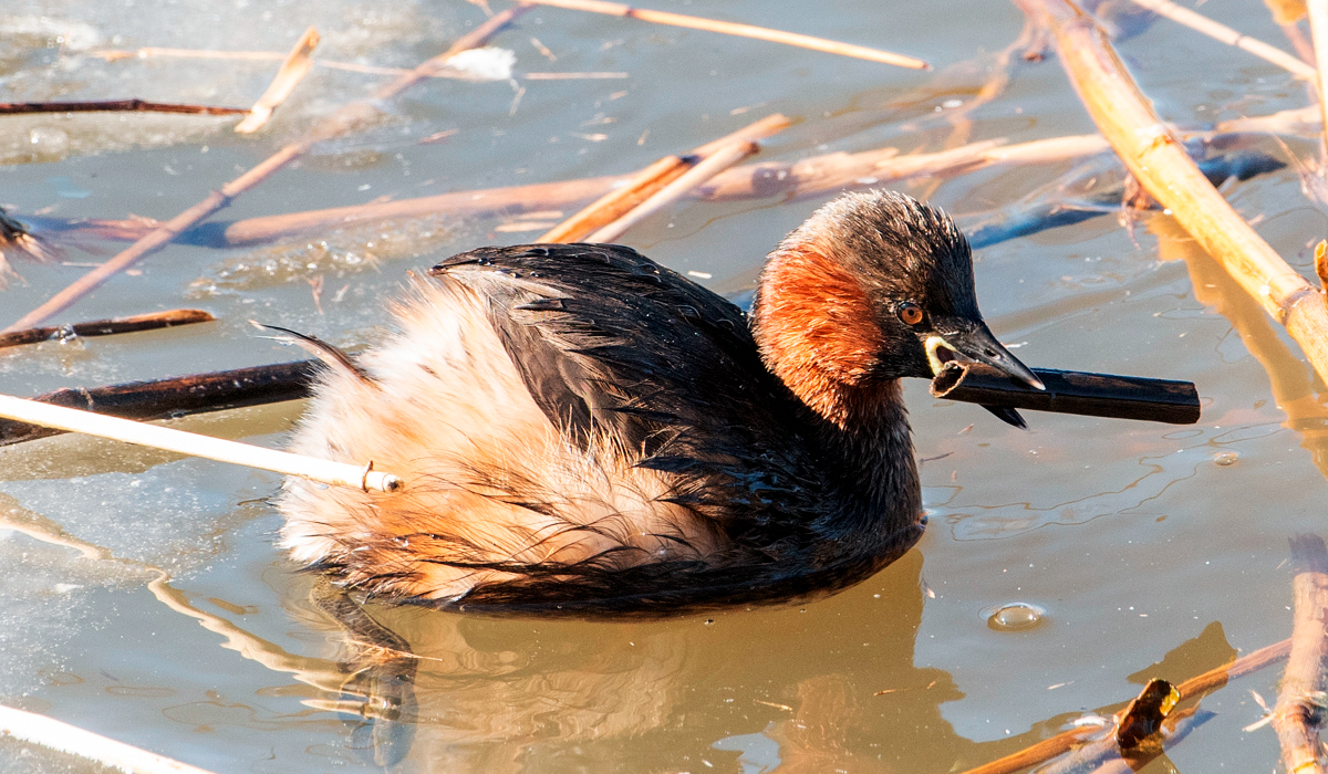 Lisääntyminen: Pesä kelluvalla alustalla, aika näkymättömissä. Pesässä 2–8 munaa.