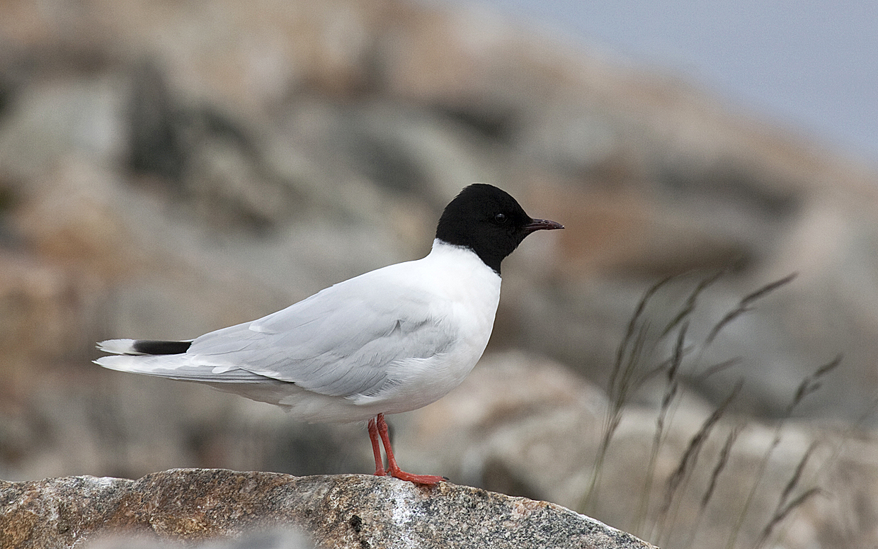 Tuntomerkit: Musta pää ja niska, tumma nokka, kirkkaanpunaiset jalat, vaalea siiven kärki, pyöreäpäinen siipi alta tumma.