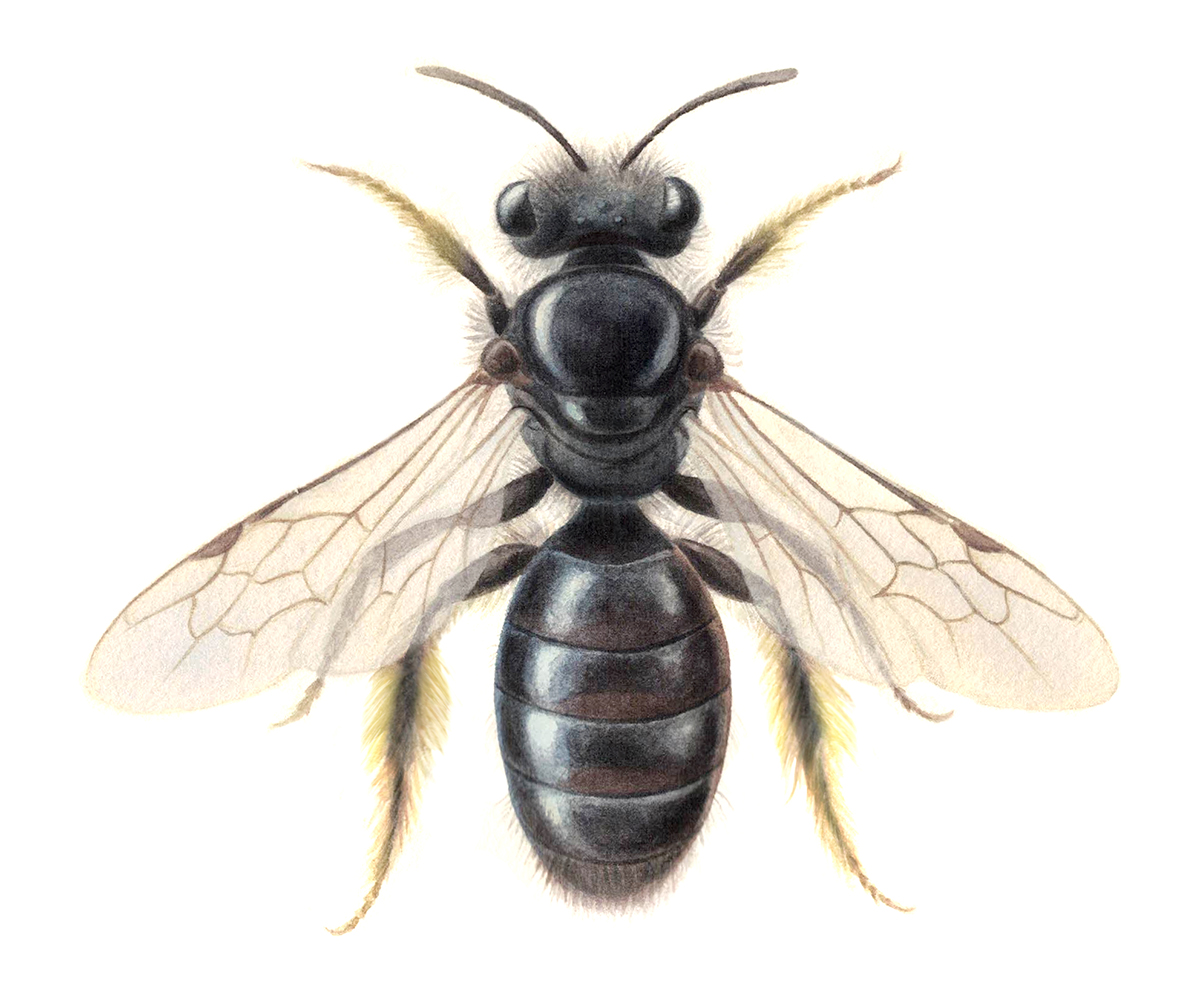 Ulkonäkö ja tuntomerkit: Pienikokoinen (8–9 milliä), musta ja vähäkarvainen, mutta naaraan takajaloissa on tuuhea keltainen karvoitus. Erityisesti koiras muistuttaa petopistiäisiä.