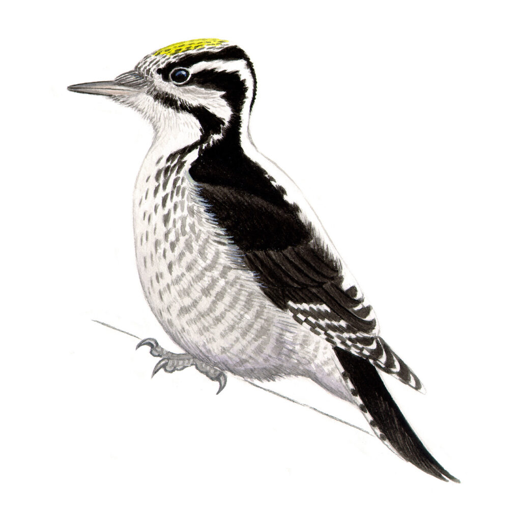 Tuntomerkit: Mustavalkoinen tikka. Selkä valkoinen ja vatsassa tiheä tumma poikkijuovitus. Puvussa ei punaista, mutta koiraan tunnistaa keltaisesta päälaesta. Naaraan päälaki vaalea. Vain kolme varvasta, kaksi eteen ja yksi taakse. Pituus 22–24 senttiä.