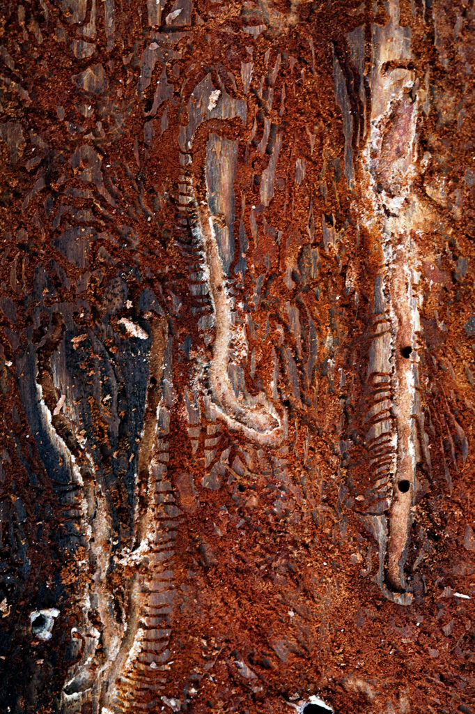 Puun kuoren alta paljastuu kaarnakuoriaisten ja niiden toukkien syömäkuvioita. Kuvio paljastaa, mikä laji puussa on elänyt.