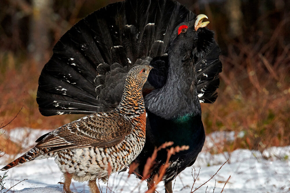 Kanalinnuilla on silmän päällä punainen heltta, joka soidinaikaan pullistuu vilkastuneen verenkierron vuoksi näkyvämmäksi. Kuvassa teeri. Kuva: Markus Varesvuo