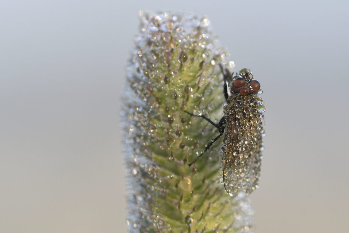 Oli rauhaisa syysaamu ja luonto kuorrutettu kastepisaroin. Kaiken kimalluksen keskellä ilahdutti pieni kärpänen, joka sekin oli kaunis kuin koru.