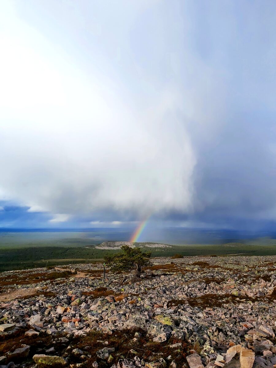 Pyöräilimme keväällä Nuorgamista Karigasniemen kautta Kemijärvelle. Pitkän pyöräilypäivän jälkeen kapusimme Luoston huipulle katsomaan maisemia. Sää loi maiseman ylle upean spektaakkelin, auringonpaisteesta sadekuuroon ja tummaan taivaaseen ja lopuksi sateenkaaret. Yksi reissun monista kohokohdista.