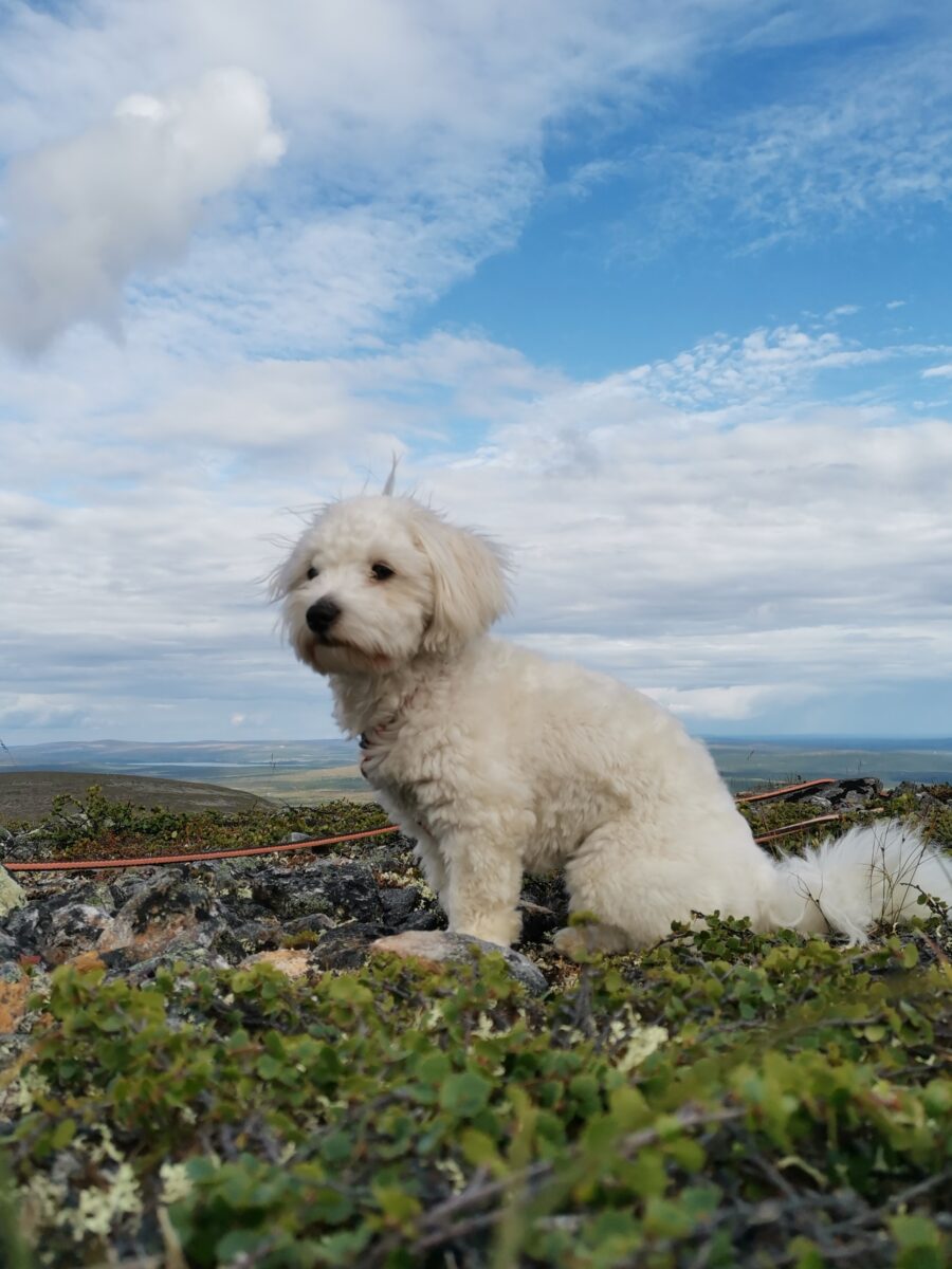 Kuvassa yhdeksän kuukauden ikäinen Limppu-koira aistii Karigasniemen Ailigas-tunturin syleilyssä esi-isiensä vapauden tuoksun.