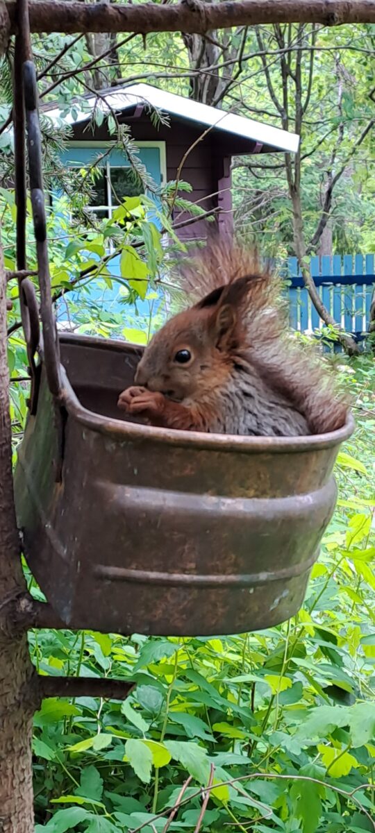 Nuoria poikasia temmelsi pihassa. Äiti orava näkyi päivittäin auringonkukan siemeniä syömässä ripustamassani ruokakupissa. Lopulta sinne osasi tulla myös pentueen vesa.