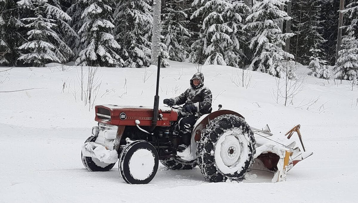 Työmatkalla ajoin Taavetista Virojoelle ja kohtasin matkalla tämän \"lumimiehen\" . Näky oli sen verran upea että oli pakko pysähtyä ja kysyä lumen kanssa kamppailevalta isännältä lupa kuvan ottamiseen ja luvan saatuani näpäytin pari ruutua kännykälläni.