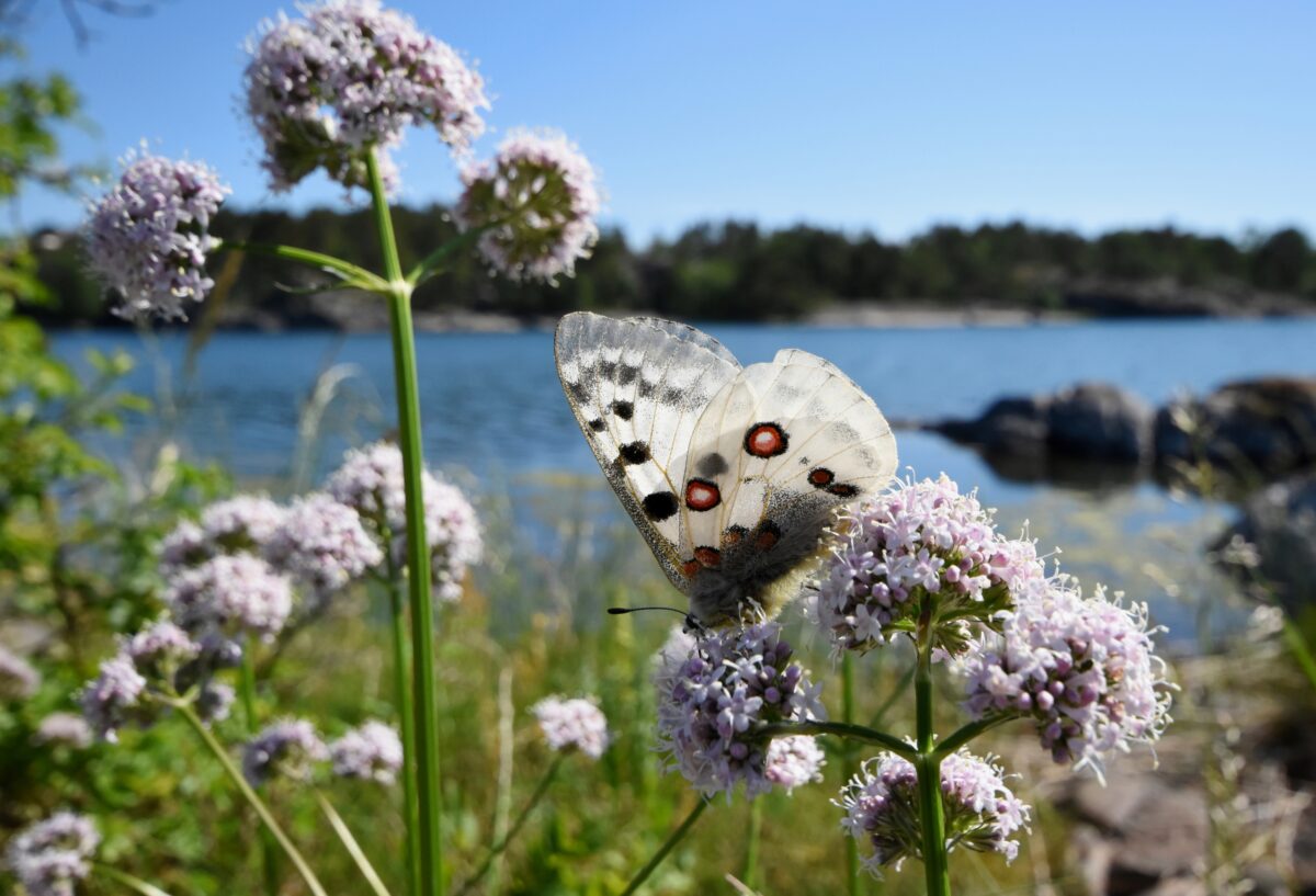 Virmajuurella ruokaileva apollo merenrantakalliollaan Föglössä 2020. Tämä rauhoitettu laji on biotoopillaan lentäessä uljas näky ja sen tapaaminen on joka kerta yhtä sykähdyttävää.