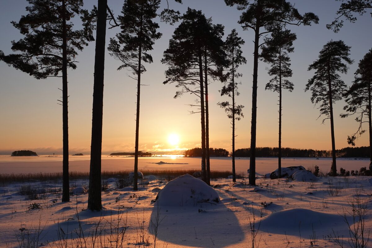 Auringonlasku jäälle Kotkassa, kovalla pakkasella.