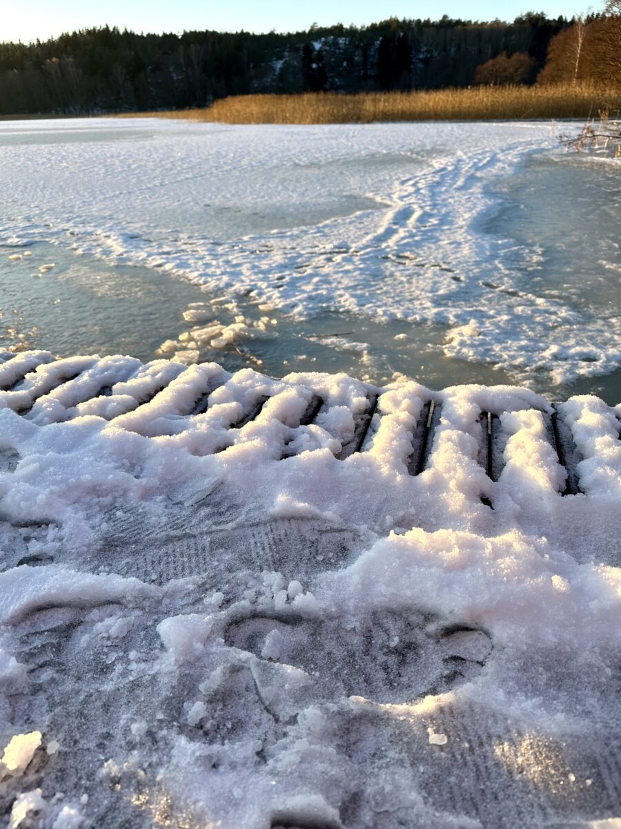 Avantouimaria ei näy ja saunakin on jo aikoja sitten jäähtynyt. Laiturille on kuitenkin jäätynyt jäljet, joista näkee miten siellä on rohkeasti kuljettu paljain jaloin pimeänä iltana