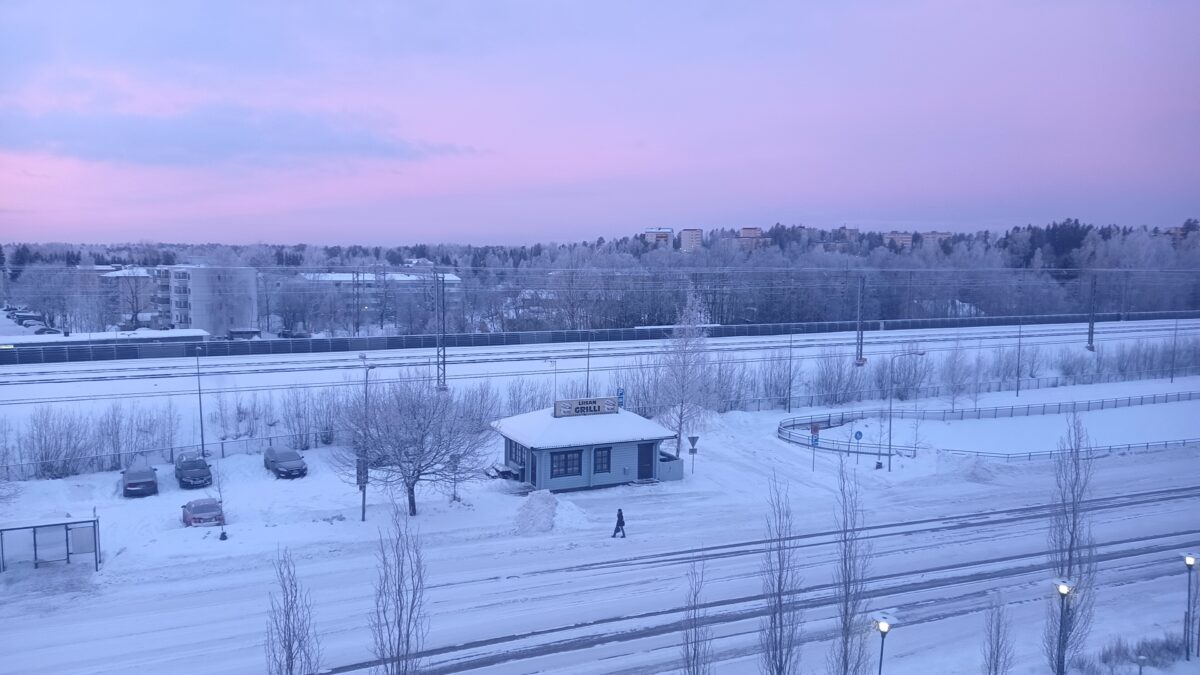 This photo was taken in the morning when the sun was raising and the sky was pink. Really a cold morning and in the middle of the photo we have a typically Finnish grilli.