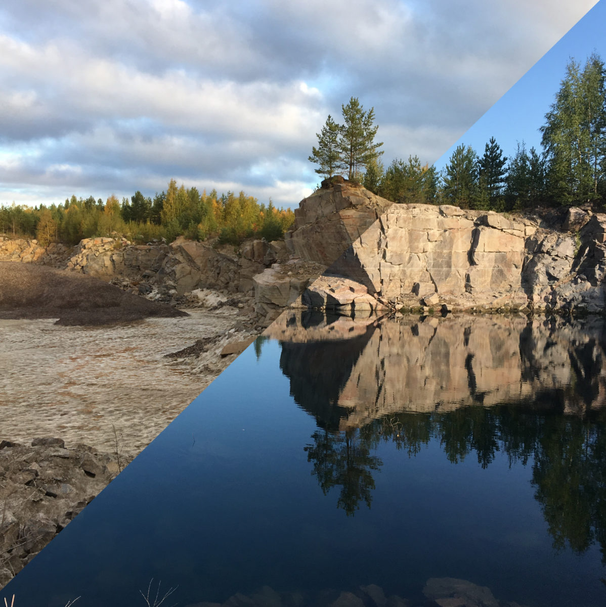 Jalasjärvellä vanha soranottopaikka oli vuosien käyttämättömyyden ansiosta muodostunut upeaksi kirkasvetiseksi uimapaikaksi. Nyt se päätettiin tyhjentää ja ottaa uudelleen käyttöön. Kuvassa yhdistyy tilanne elokuun 2018 puolivälissä parhaimpana uimakautena ja lokakuun alussa jäljellä oli enää muistot sekä kesästä että vedestä.