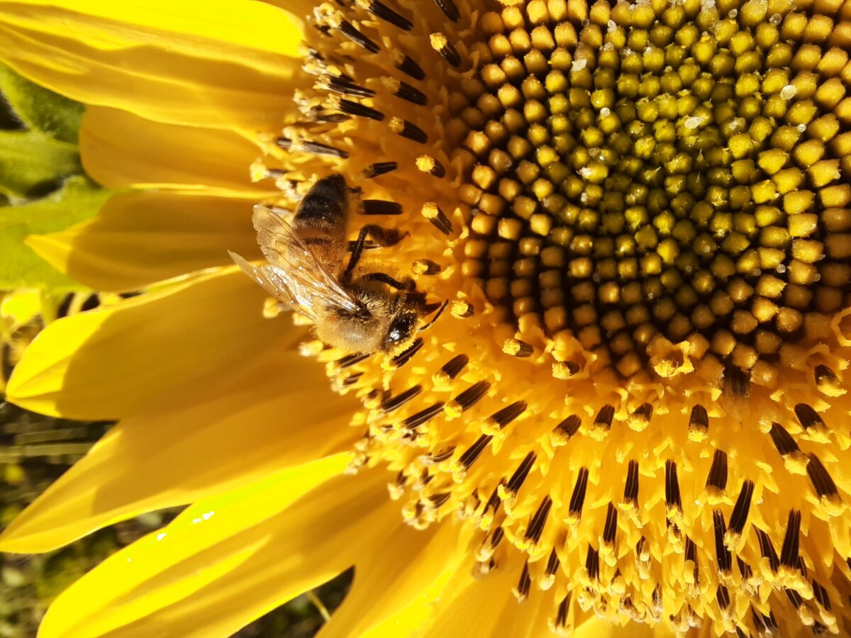 Kävin loppukesästä poimimassa auringonkukkia läheisellä auringonkukkapellolla. Olin juuri poiminut tämän auringonkukan, kun tämä pikku pörriäinen laskeutui kukalle tekemään tärkeää työtään eikä ollut moksiskaan vaikka kukka oli liikkeessä. Tovi siinä meni, että sain hätyyteltyä pörriäisen vielä paikallaan olevien auringonkukkien luokse.