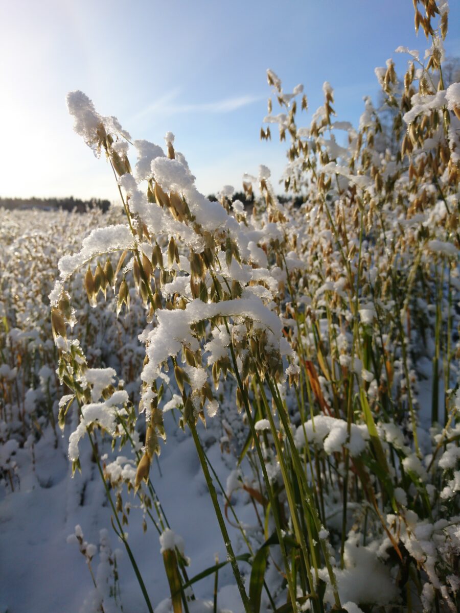 Syksyinen aamu ensilumi satanut yöllä ja kaurapelon reunaan jäänyt muutama tähkä puimurilta suojaan.