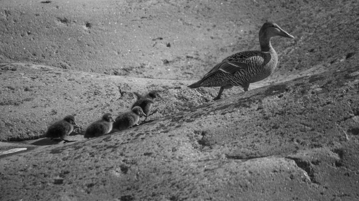 Tämä kuva on toukokuulta 2024. Sain seurata kun emo vie poikasiaan ensimmäiselle uinnille. Tepsutellen emo vei poikaset ensin pieneen lätäkköön totuttelemaan. Myöhemmin he rynnistivät yksi kerrallaan jyrkkää kallionreunaa pitkin suoraan alas Saaristomeren aaltoihin.