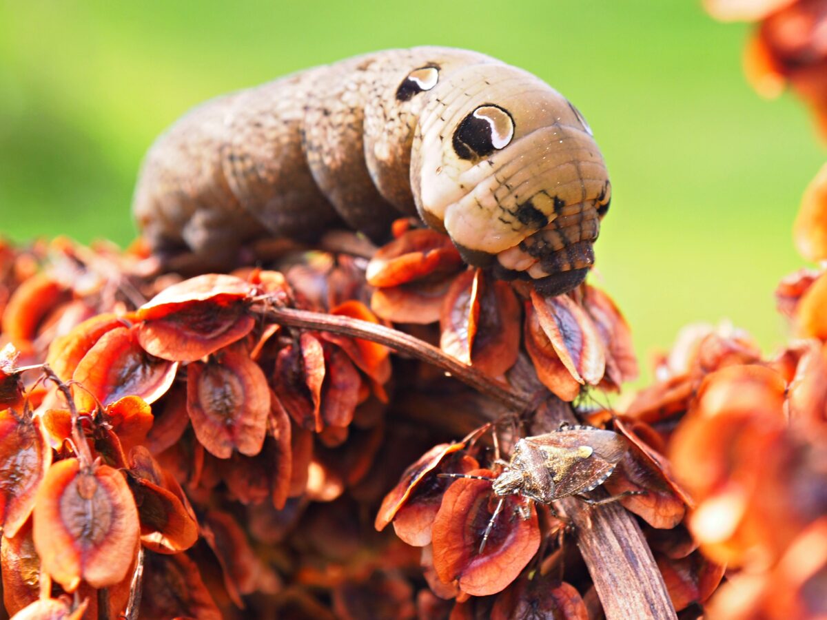 Kuvasin kesäpäivänä raparperin siemenkodassa ryömivää perhosentoukkaa. Yht-äkkiä jostain ilmestyi lude, joka kävi tervehtimässä toukkaa ja ikäänkuin alkoi johdattaa sitä lehtien alle suojaan.