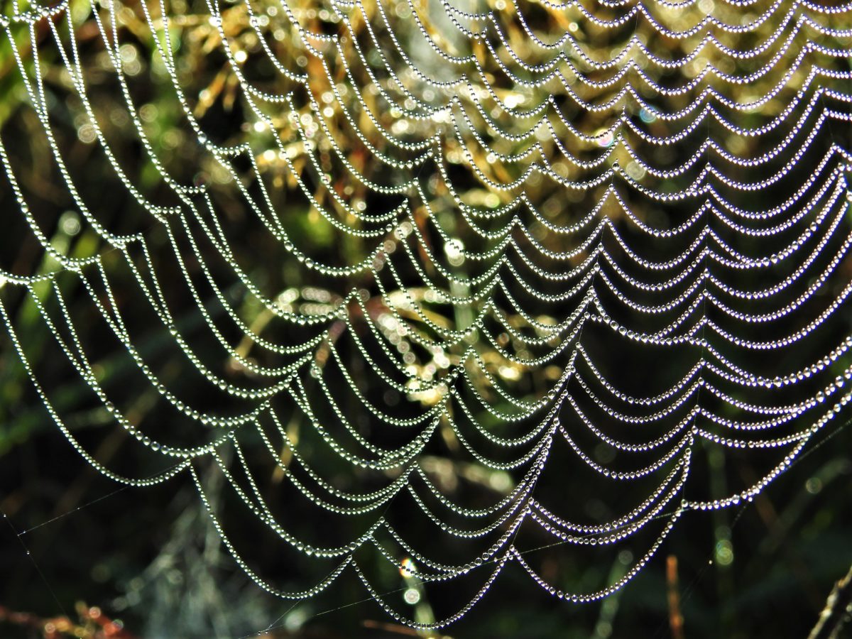 Aamuauringon säteet paljastavat hämähäkin mestariteoksen. Kuin helminauhaa on kutojamestari loihtinut.