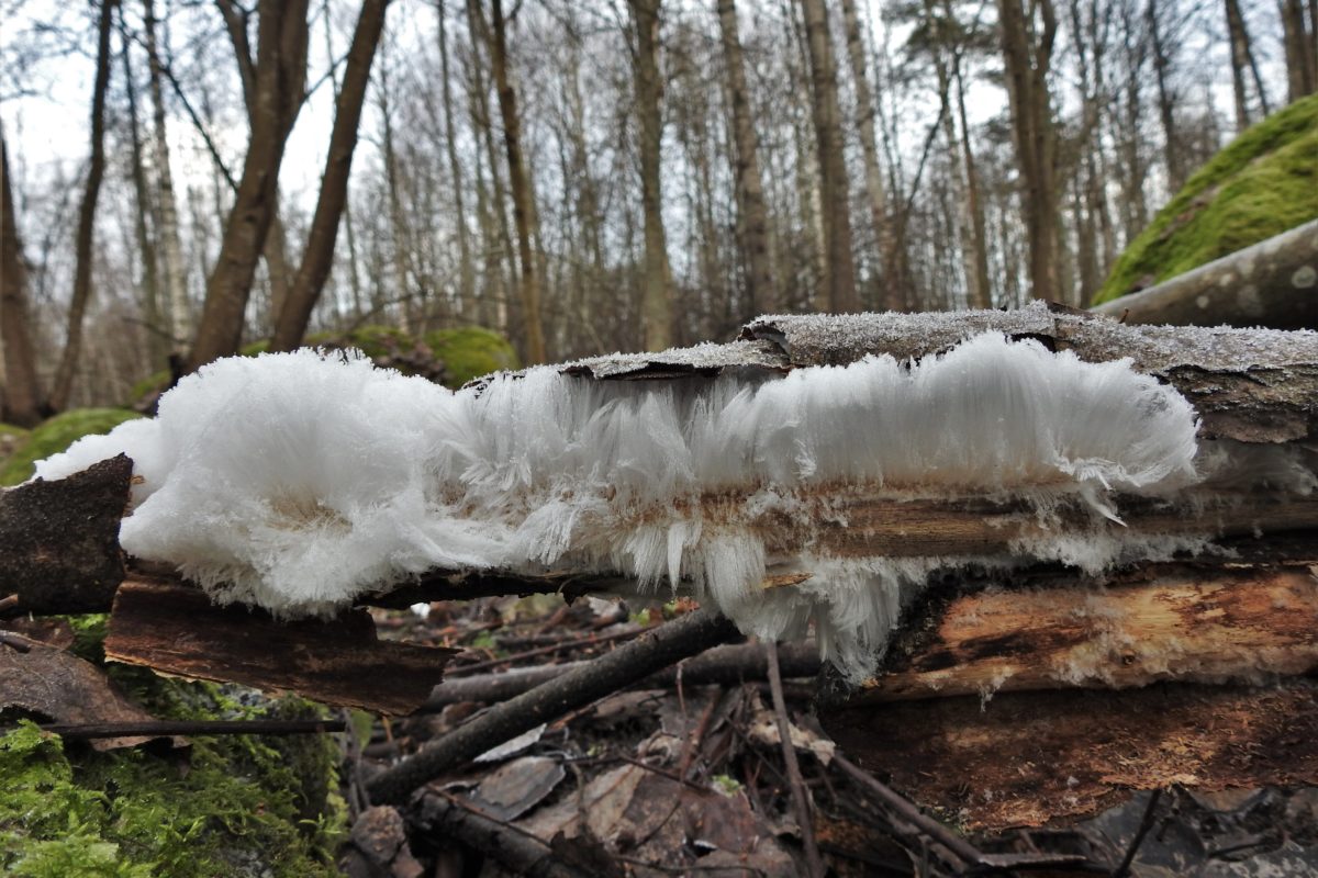 Pitäisi olla paksu lumipeite ja pakkanen, tammikuuta kun eletään, mutta Keski-Suomessakin maa on lumeton ja lämpötilat vaihtelee pikkupakkasesta reilusti lämpöasteiden puolella, vettäkin on satanut. Otolliset olosuhteet hiusjään syntymiselle. Ruskea maa onkin saanut monin paikoin koristeekseen hiusjäitä maassa makaavien lahojen puiden ympärille.