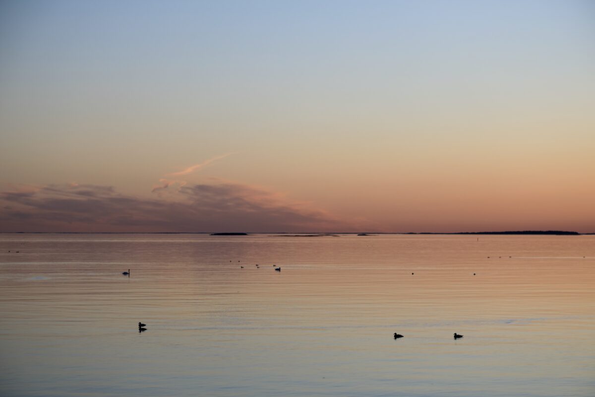 Minä katselen Itämerta lähinnä Suomenlahden rantakallioilta. Auringonlasku ja sen jälkeinen loimotus - etenkin keväisin pimeän talven jälkeen - on kuin lupaus paremmista ajoista. Tähän kun lisätään muuttolintujen paluu: haahkojen ja allien äänet tyynellä ulapalla, kaakattavien hanhien ylilento, kurkiauran töräytykset ja telkkien siivistä lähtevät vihellykset - muunmuassa - sulattavat väkevyydessään mielestä talven aiheuttaman kohmeuden. Onneksi auringonlaskuja on tarjolla ympäri vuoden...