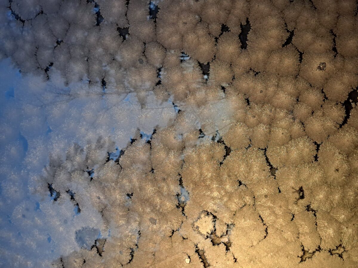 Aamulla tuulettaessa tupaa parvekkeen ikkuna huurtuu kauniisti tehden upeita kuvioita.