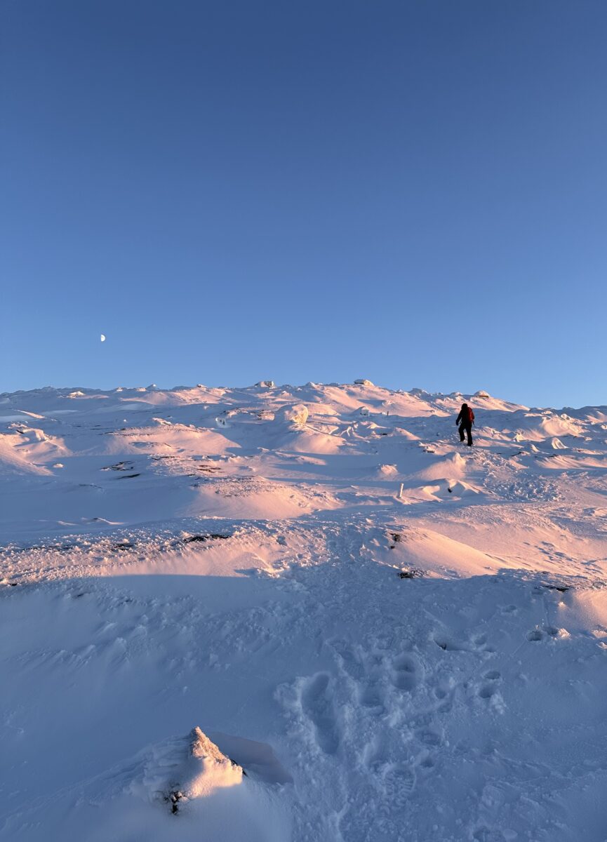 Reissu Kilpisjärvelle ihastelemaan auringon paluuta. Taivas tarjoili parastaan ja tunturit loi siluetteja. Pakkasta alhaalla noin -30. Rauhallinen retki Saanan huipulle 19.1.2024. Kuvassa aviomieheni, jonka kanssa retkiä tehty jo 18-vuotta.