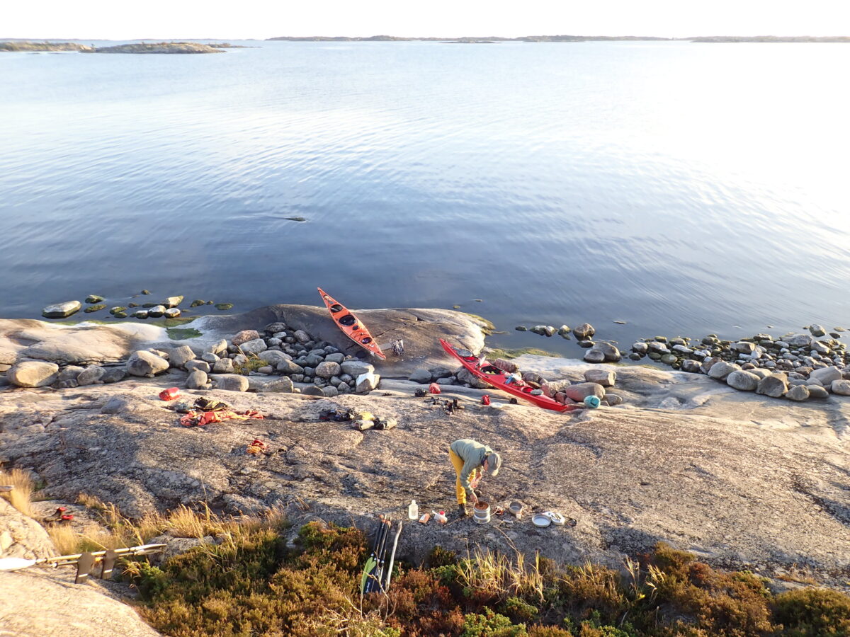 Melontavaelluksella Saaristomerellä rantauduttu seuraavalle yöpymissaarelle. Iltapalan laittoa ja telttapaikan etsimistä.
