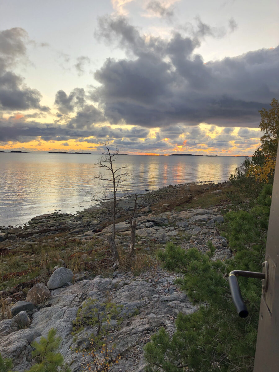 Kuva on otettu Turun saaristossa asumattomalta saarelta kyttäyskopista. Illan tulo toi kauniit laskevan auringon värjäämät pilvet. Ohi lipui myös joutsenperhe, jota tosin tässä kuvassa ei näy. Tunnelma oli seesteinen, meri tyyntyi ja äänet vaimenivat.