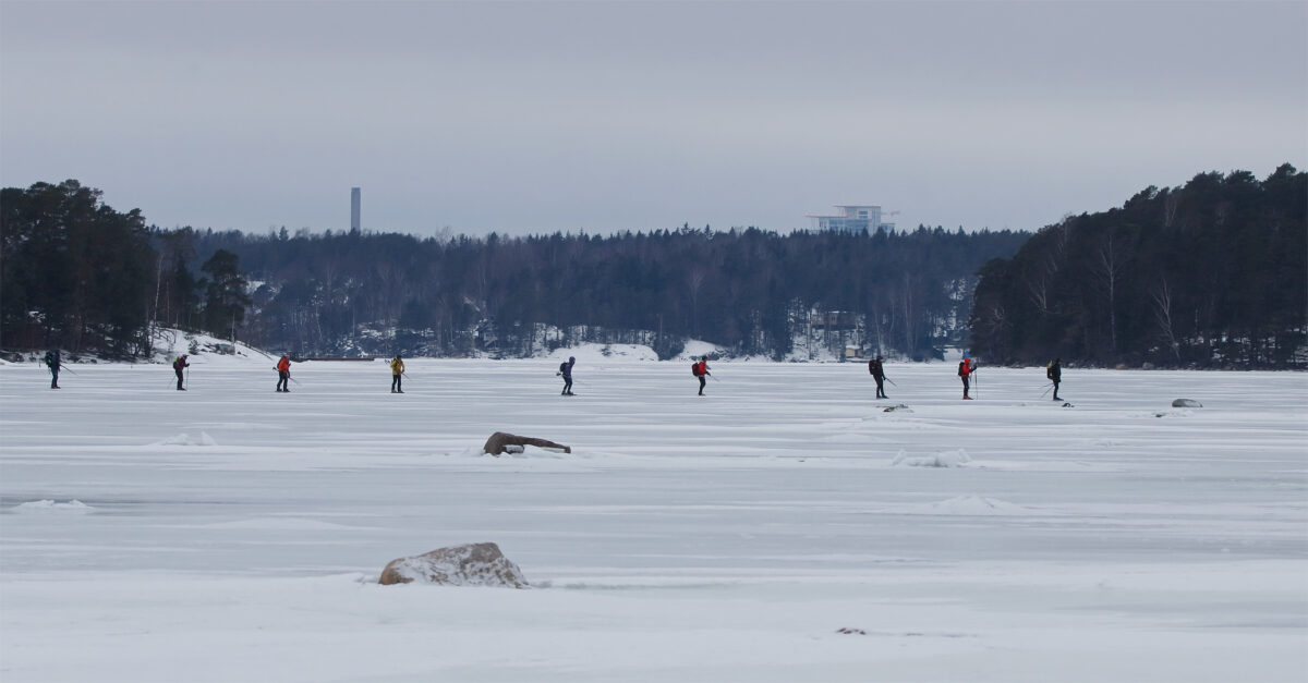 Retkiluistelijat Helsingin sisäsaaristossa tammikuussa.