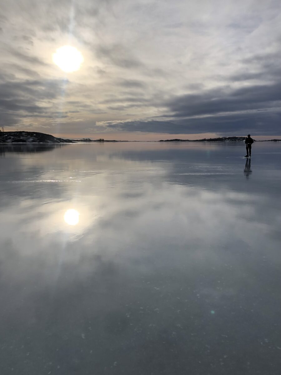 Kuva on luistelureissulta Ahvenanmaan Jurmosta 3.2.2024. Ainoa kerta kun olen saanut luistella auringon noustusta sen laskuun. Lumettoman jään kesyttämä meri ja luonto oli niin kaunis ja antoi meille jotain mitä en ollut kuvitellut koskaan olevan edes olemassa ja sille ei ole sanoja. Jää tekee myös merestä hiljaisen ja se on puhuttelevaa.