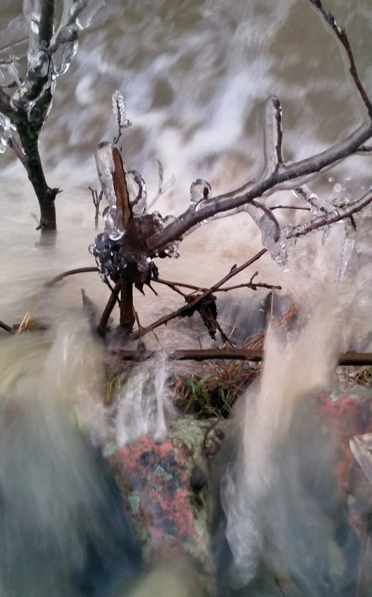 Hämärtyvässä illassa kävelin lähikoskelle. Jää aina vangitsee sen ainutkertaisia muodoilla. Joku jää ja virtaava vesi vie eteenpäin. Kännykkään tallentui hienoja värejä pohjasta.