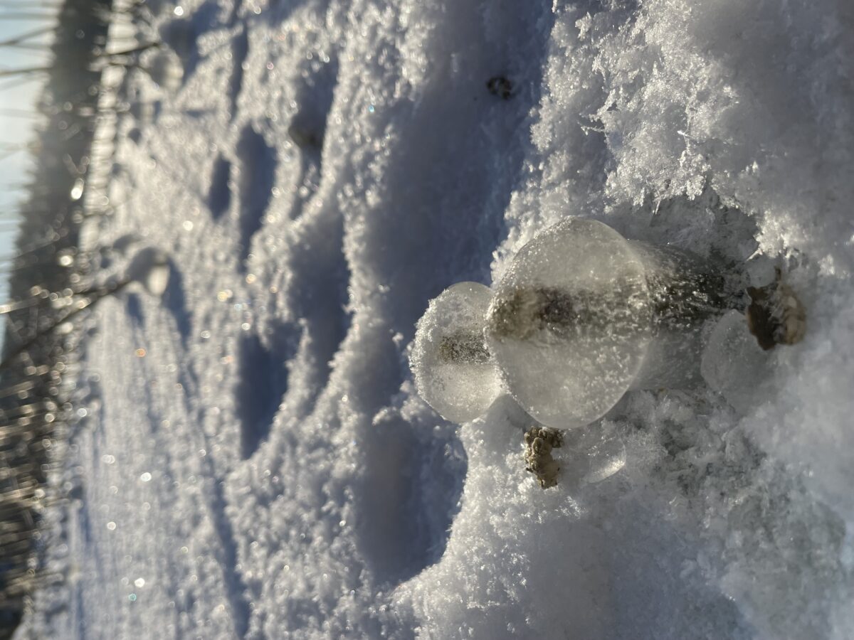 Olimme koirani kanssa kävelyllä merenjäällä ja koirani innostui laiskojen tyveen muodostuneista jääpalluroista ja katkoi niistä puremalla latvat leikkiessään. Tuloksena syntyi tällaisia jäätatteja.