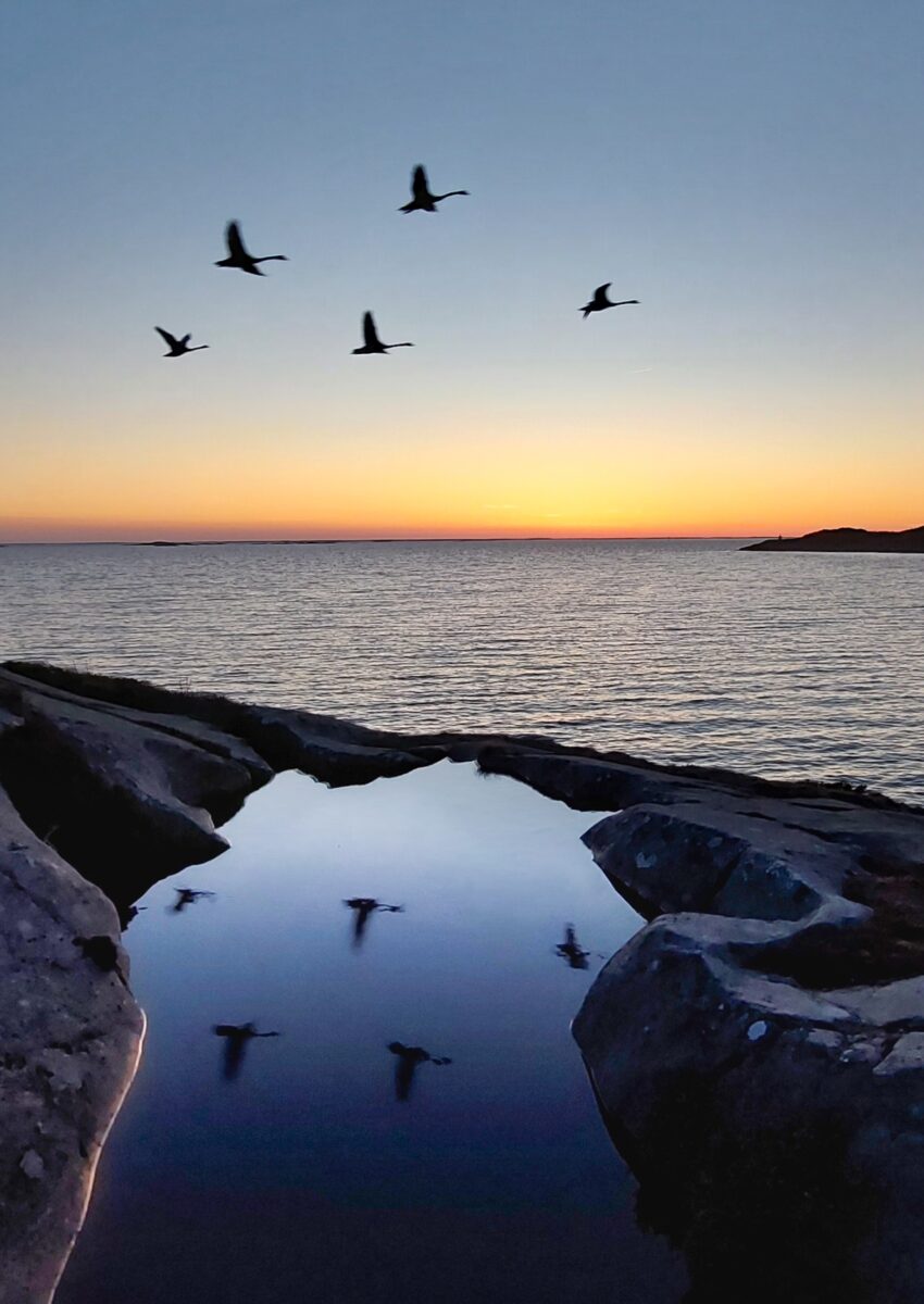 Olin kuvaamassa auringon laskua Kökarilla toukokuussa. Oli kaunis tyyni ilta. Etsin heijastuksia tämän lammen pinnasta. Kuulin lähestyvien joutsenten siipiäänet. Nopeasti laitoin kameran lasjakulmatilaan, ja sattumalta laukaisu onnistui juuri oikeaan aikaan; kaikki joutsenet heijastuivat myös lammen peilistä.